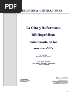 Debido a que el material de una entrevista no se puede reproducir para quien lee un trabajo de investigacin no es obligatorio que se cite en la Bibliografa final. Sin embargo, sera muy conveniente hacer una referencia a la entrevista dentro del cuerpo principal de su trabajo, a manera de comunicacin personal: ... y este punto fue concedido (J. Bloggs, entrevista personal, 22 de agosto de 2001). Fuentes electrnicas: El patrn bsico para una referencia electrnica es: Autor, inicial(es) de su nombre (ao). Ttulo. Mes, da, ao, direccin en Internet. Bancos, I. (n.d.). Los NHS marcan la pauta del cuidado de la salud. Obtenida el 29 de agosto de 2001, de [Link] Si no consigue identificar la fecha en que el documento fue publicado, utilice la abreviatura n.d. (no date [sin fecha]). Si no consigue identificar al autor, empiece su referencia con el ttulo del documento. Si el documento se ubica dentro de una pgina institucional, como la de alguna universidad o departamento gubernamental, primero cite el nombre de la organizacin o del departamento en cuestin, antes de dar la direccin electrnica: Alexander, J., & Tate, M. A. (2001). Evaluando las Fuentes Electrnicas. Consultado el 21 de agosto de 2001, Widener University, pgina web conmemorativa de la biblioteca Wolfgram: [Link] Decidiendo su futuro. (2000). Consultado el 5 de septiembre de 2001, Portsmouth University, pgina web de Servicios Profesionales: [Link]