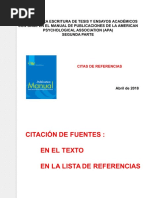 LAS CITAS Una citacin es una forma de referencia breve colocada entre parntesis dentro de un texto o aadida a un texto como nota a pie de pgina, al final de un captulo, o al final de la obra completa. La citacin permite identificar la publicacin de la que se extrae la idea parafraseada. Ejemplo: (Umberto Eco, 1993, p.240-245)