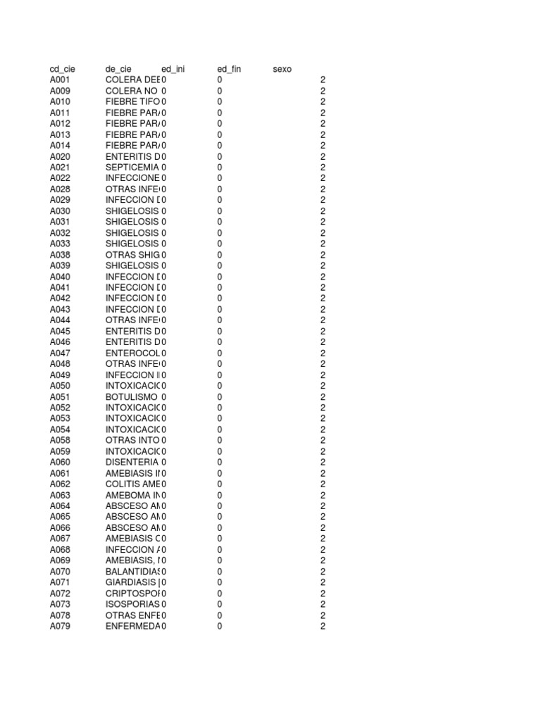 de_cie ed_ini ed_fin sexo COLERA DEBIDO A VIBRIO0CHOLERAE O1, BIOTIPO EL TOR 0 2 COLERA NO ESPECIFICADO 0 0 2 FIEBRE TIFOIDEA 0 0 2 FIEBRE PARATIFOIDEA A 0 0 2 FIEBRE PARATIFOIDEA B 0 0 2 FIEBRE PARATIFOIDEA C 0 0 2 FIEBRE PARATIFOIDEA, NO ESPECIFICADA 0 0 2 ENTERITIS DEBIDA A SALMONELLA 0 0 2 SEPTICEMIA DEBIDA A SALMONELLA 0 0 2 INFECCIONES LOCALIZADAS DEBIDA A SALMONELLA 0 0 2 OTRAS INFECCIONES ESPECIFICADAS COMO DEBIDAS A SALMONELLA 0 0 2 INFECCIN DEBIDA A SALMONELLA NO ESPECIFICADA 0 0 2 SHIGELOSIS DEBIDA A SHIGELLA DYSENTERIAE 2 0 0 SHIGELOSIS DEBIDA A SHIGELLA FLEXNERI 0 0 2 SHIGELOSIS DEBIDA A SHIGELLA BOYDII 0 0 2 SHIGELOSIS DEBIDA A SHIGELLA SONNEI 0 0 2 OTRAS SHIGELOSIS 0 0 2 SHIGELOSIS DE TIPO NO ESPECIFICADO 0 0 2 INFECCION DEBIDA A ESCHERICHIA COLI ENTEROPATOGENA 0 0 2 INFECCION DEBIDA A ESCHERICHIA COLI ENTEROTOXIGENA 0 0 2 INFECCION DEBIDA A ESCHERICHIA COLI ENTEROINVASIVA 0 0 2 INFECCION DEBIDA A ESCHERICHIA COLI ENTEROHEMORRAGICA 0 0 2 OTRAS INFECCIONES INTESTINALES DEBIDAS A ESCHERICHIA COLI 0 0 2 ENTERITIS DEBIDA A CAMPYLOBACTER 0 0 2 ENTERITIS DEBIDA A YERSINIA ENTEROCOLITICA 2 0 0 ENTEROCOLITIS DEBIDA A CLOSTRIDIUM DIFFICILE 0 0 2 OTRAS INFECCIONES INTESTINALES BACTERIANAS ESPECIFICADAS 0 0 2 INFECCION INTESTINAL BACTERIANA, NO ESPECIFICADA 0 0 2 INTOXICACION ALIMENTARIA ESTAFILOCOCICA 2 0 0 BOTULISMO 0 0 2 INTOXICACION ALIMENTARIA DEBIDA A CLOSTRIDIUM PERFRINGENS [CLOSTRIDIUM WELCHII] 0 0 2 INTOXICACION ALIMENTARIA DEBIDA A VIBRIO PARAHAEMOLYTICUS 0 0 2 INTOXICACION ALIMENTARIA DEBIDA A BACILLUS 2 0 0 CEREUS OTRAS INTOXICACIONES ALIMENTARIAS DEBIDAS2A BACTERIAS ESPECIFICADAS 0 0 INTOXICACION ALIMENTARIA BACTERIANA, NO ESPECIFICADA 0 0 2 DISENTERIA AMEBIANA AGUDA 0 0 2 AMEBIASIS INTESTINAL CRONICA 0 0 2 COLITIS AMEBIANA NO DISENTERICA 0 0 2 AMEBOMA INTESTINAL 0 0 2 ABSCESO AMEBIANO DEL 0 0 HIGADO 2 ABSCESO AMEBIANO DEL 0 0 PULMON (J99.8*) 2 ABSCESO AMEBIANO DEL 0 0 CEREBRO (G07*) 2 AMEBIASIS CUTANEA 0 0 2 INFECCION AMEBIANA DE 0 0 OTRAS LOCALIZACIONES 2 AMEBIASIS, NO ESPECIFICADA 0 0 2 BALANTIDIASIS 0 0 2 GIARDIASIS [LAMBLIASIS] 0 0 2 CRIPTOSPORIDIOSIS 0 0 2 ISOSPORIASIS 0 0 2 OTRAS ENFERMEDADES INTESTINALES ESPECIFICADAS DEBIDAS A PROTOZOARIOS 0 0 2 ENFERMEDAD INTESTINAL DEBIDA A PROTOZOARIOS, NO ESPECIFICADA 0 0 2