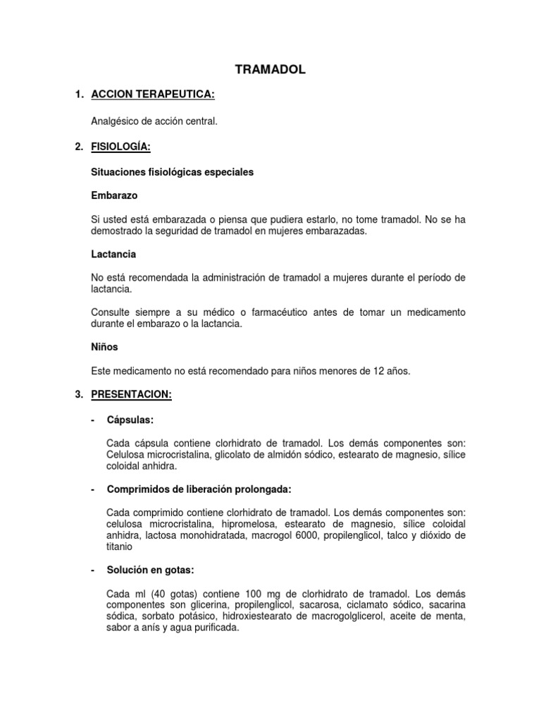 Analgsico de accin central. 2. FISIOLOGA: Situaciones fisiolgicas especiales Embarazo Si usted est embarazada o piensa que pudiera estarlo, no tome tramadol. No se ha demostrado la seguridad de tramadol en mujeres embarazadas. Lactancia No est recomendada la administracin de tramadol a mujeres durante el perodo de lactancia. Consulte siempre a su mdico o farmacutico antes de tomar un medicamento durante el embarazo o la lactancia. Nios Este medicamento no est recomendado para nios menores de 12 aos. 3. PRESENTACION: Cpsulas: Cada cpsula contiene clorhidrato de tramadol. Los dems componentes son: Celulosa microcristalina, glicolato de almidn sdico, estearato de magnesio, slice coloidal anhidra. Comprimidos de liberacin prolongada: Cada comprimido contiene clorhidrato de tramadol. Los dems componentes son: celulosa microcristalina, hipromelosa, estearato de magnesio, slice coloidal anhidra, lactosa monohidratada, macrogol 6000, propilenglicol, talco y dixido de titanio Solucin en gotas: Cada ml (40 gotas) contiene 100 mg de clorhidrato de tramadol. Los dems componentes son glicerina, propilenglicol, sacarosa, ciclamato sdico, sacarina sdica, sorbato potsico, hidroxiestearato de macrogolglicerol, aceite de menta, sabor a ans y agua purificada.