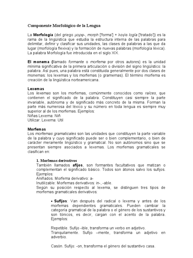 La Morfologa (del griego -, morph ['forma'] + loga ['tratado']) es la rama de la lingstica que estudia la estructura interna de las palabras para delimitar, definir y clasificar sus unidades, las clases de palabras a las que da lugar (morfologa flexiva) y la formacin de nuevas palabras (morfologa lxica). La palabra Morfologa fue introducida en el siglo XIX. El monema (llamado formante o morfema por otros autores) es la unidad mnima significativa de la primera articulacin o divisin del signo lingstico: la palabra. As pues, una palabra est constituida generalmente por dos clases de monemas: los lexemas y los morfemas (o gramemas). El trmino morfema es creacin de la lingstica norteamericana. Lexemas Los lexemas son los morfemas, comnmente conocidos como races, que contienen el significado de la palabra. Constituyen casi siempre la parte invariable, autnoma y de significado ms concreto de la misma. Forman la parte ms numerosa del lxico y su nmero en toda lengua es siempre muy superior al de los morfemas. Ejemplos: Nias Lexema: Ni Utilizar. Lexema: Util Morfemas Los morfemas gramaticales son las unidades que constituyen la parte variable de la palabra y cuyo significado puede ser o bien complementario, o bien de carcter meramente lingstico y gramatical. No son autnomos sino que se presentan siempre asociados a lexemas. Los morfemas gramaticales se clasifican en: 1. Morfemas derivativos Tambin llamados afijos, son formantes facultativos que matizan o complementan el significado bsico. Todos son tonos salvo los sufijos. Ejemplos: Aniados. Morfema derivativo: aInutilizable: Morfemas derivativos: in-, -able. Segn su posicin respecto al lexema, se distinguen tres tipos de morfemas gramaticales derivativos: Sufijos: Van despus del radical o lexema y antes de los morfemas dependientes gramaticales. Pueden cambiar la categora gramatical de la palabra o el gnero de los sustantivos y son tnicos, es decir, cargan con el acento de la palabra. Ejemplos: