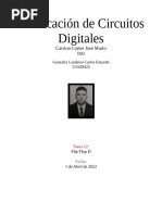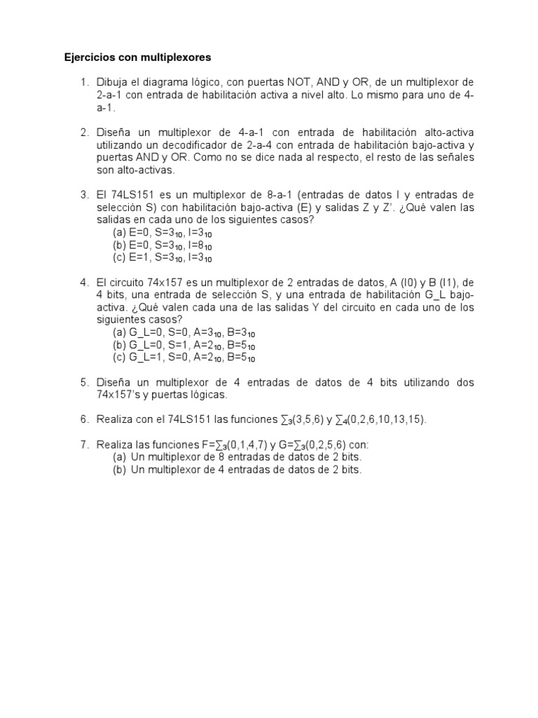 Dibuja el diagrama lgico, con puertas NOT, AND y OR, de un multiplexor de 2-a-1 con entrada de habilitacin activa a nivel alto. Lo mismo para uno de 4a-1. 2. Disea un multiplexor de 4-a-1 con entrada de habilitacin alto-activa utilizando un decodificador de 2-a-4 con entrada de habilitacin bajo-activa y puertas AND y OR. Como no se dice nada al respecto, el resto de las seales son alto-activas. 3. El 74LS151 es un multiplexor de 8-a-1 (entradas de datos I y entradas de seleccin S) con habilitacin bajo-activa (E) y salidas Z y Z. Qu valen las salidas en cada uno de los siguientes casos? (a) E=0, S=310, I=310 (b) E=0, S=310, I=810 (c) E=1, S=310, I=310 4. El circuito 74x157 es un multiplexor de 2 entradas de datos, A (I0) y B (I1), de 4 bits, una entrada de seleccin S, y una entrada de habilitacin G_L bajoactiva. Qu valen cada una de las salidas Y del circuito en cada uno de los siguientes casos? (a) G_L=0, S=0, A=310, B=310 (b) G_L=0, S=1, A=210, B=510 (c) G_L=1, S=0, A=210, B=510 5. Disea un multiplexor de 4 entradas de datos de 4 bits utilizando dos 74x157s y puertas lgicas. 6. Realiza con el 74LS151 las funciones 3(3,5,6) y 4(0,2,6,10,13,15). 7. Realiza las funciones F=3(0,1,4,7) y G=3(0,2,5,6) con: (a) Un multiplexor de 8 entradas de datos de 2 bits. (b) Un multiplexor de 4 entradas de datos de 2 bits.