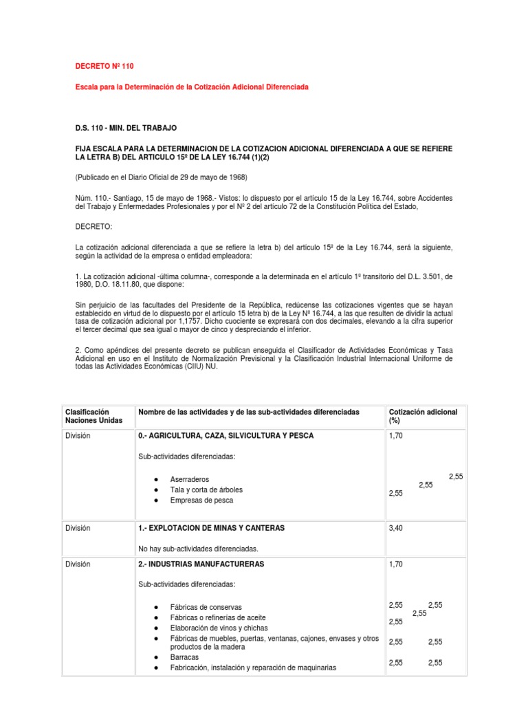 D.S. 110 - MIN. DEL TRABAJO FIJA ESCALA PARA LA DETERMINACION DE LA COTIZACION ADICIONAL DIFERENCIADA A QUE SE REFIERE LA LETRA B) DEL ARTICULO 15 DE LA LEY 16.744 (1)(2) (Publicado en el Diario Oficial de 29 de mayo de 1968) Nm. 110.- Santiago, 15 de mayo de 1968.- Vistos: lo dispuesto por el artculo 15 de la Ley 16.744, sobre Accidentes del Trabajo y Enfermedades Profesionales y por el N 2 del artculo 72 de la Constitucin Poltica del Estado, DECRETO: La cotizacin adicional diferenciada a que se refiere la letra b) del artculo 15 de la Ley 16.744, ser la siguiente, segn la actividad de la empresa o entidad empleadora: 1. La cotizacin adicional -ltima columna-, corresponde a la determinada en el artculo 1 transitorio del D.L. 3.501, de 1980, D.O. 18.11.80, que dispone: Sin perjuicio de las facultades del Presidente de la Repblica, redcense las cotizaciones vigentes que se hayan establecido en virtud de lo dispuesto por el artculo 15 letra b) de la Ley N 16.744, a las que resulten de dividir la actual tasa de cotizacin adicional por 1,1757. Dicho cuociente se expresar con dos decimales, elevando a la cifra superior el tercer decimal que sea igual o mayor de cinco y despreciando el inferior. 2. Como apndices del presente decreto se publican enseguida el Clasificador de Actividades Econmicas y Tasa Adicional en uso en el Instituto de Normalizacin Previsional y la Clasificacin Industrial Internacional Uniforme de todas las Actividades Econmicas (CIIU) NU.