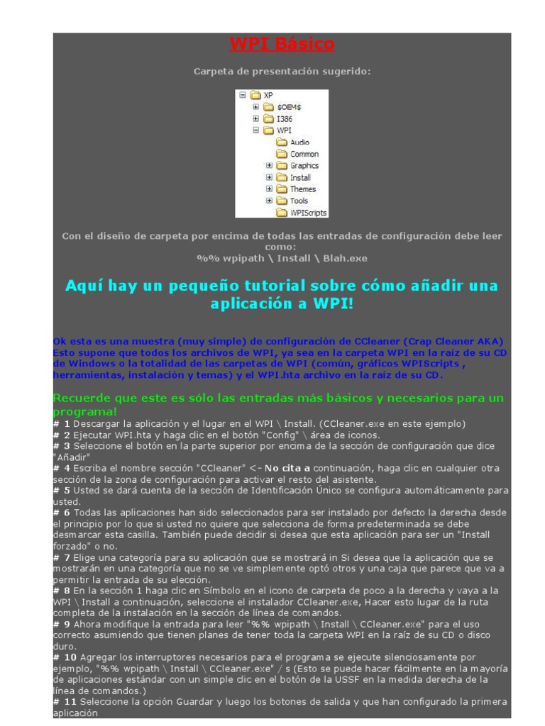 # 1 Descargar la aplicacin y el lugar en el WPI \ Install. ([Link] en este ejemplo) # 2 Ejecutar [Link] y haga clic en el botn "Config" \ rea de iconos. # 3 Seleccione el botn en la parte superior por encima de la seccin de configuracin que dice "Aadir" # 4 Escriba el nombre seccin "CCleaner" <- No cita a continuacin, haga clic en cualquier otra seccin de la zona de configuracin para activar el resto del asistente. # 5 Usted se dar cuenta de la seccin de Identificacin nico se configura automticamente para usted. # 6 Todas las aplicaciones han sido seleccionados para ser instalado por defecto la derecha desde el principio por lo que si usted no quiere que selecciona de forma predeterminada se debe desmarcar esta casilla. Tambin puede decidir si desea que esta aplicacin para ser un "Install forzado" o no. # 7 Elige una categora para su aplicacin que se mostrar in Si desea que la aplicacin que se mostrarn en una categora que no se ve simplemente opt otros y una caja que parece que va a permitir la entrada de su eleccin. # 8 En la seccin 1 haga clic en Smbolo en el icono de carpeta de poco a la derecha y vaya a la WPI \ Install a continuacin, seleccione el instalador [Link], Hacer esto lugar de la ruta completa de la instalacin en la seccin de lnea de comandos. # 9 Ahora modifique la entrada para leer "%% wpipath \ Install \ [Link]" para el uso correcto asumiendo que tienen planes de tener toda la carpeta WPI en la raz de su CD o disco duro. # 10 Agregar los interruptores necesarios para el programa se ejecute silenciosamente por ejemplo, "%% wpipath \ Install \ [Link]" / s (Esto se puede hacer fcilmente en la mayora de aplicaciones estndar con un simple clic en el botn de la USSF en la medida derecha de la lnea de comandos.) # 11 Seleccione la opcin Guardar y luego los botones de salida y que han configurado la primera aplicacin