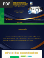 ANATOMIA DE LA BASE DE CRNEO El lmite entre la calota y la base del crneo, es una lnea imaginria, que comienza en la sutura frontonasal, se contina por la base de la mastoides, llega a la protuberancia occipital externo y de ah, da toda la vuelta hasta llegar y cerrarse en la sutura frontonasal del lado contralateral. La base del crneo tiene dos caras: Una interna, tambin llamada cerebral, que constituye el piso del endocrneo, esta formada por tres fosas: Anterior, Media y Posterior La fosa anterior est compuesta por el etmoides, esfenoides y el frontal. La media tiene como estructura central a la silla turca, y podemos visualizar al agujero oval, el redondo menor, el redondo mayor y el rasgado anterior. Por el agujero oval pasan el nervio trigmino y la arteria meningea media. Lo localizamos en el ala mayor del esfenoides. Por el menor pasa la vena meningea media. Por el mayor pasa el nervio del maxilar superior, y en realidad no se lo puede ubicar en la posicin de Hirtz. Debemos realizar la posicin de Cadwell, donde generalmente se lo ubica dentro de los senos paranasales, cerca del techo. La fosa posterior se encuentra por detrs de la silla turca, y encontramos como estructura mas sobresaliente al agujero occipital, las fosas cerebelosas y al agujero rasgado posterior cuya localizacin es en el borde posterior del peasco, y por el pasan, los pares craneales glosofarngeo, neumogstrico y espinal . Adems la vena yugular interna. La mejor manera de radiografiarlo es la Submentovertex. La cara externa de la base, presta insercin a los msculos y tendones del cuello.