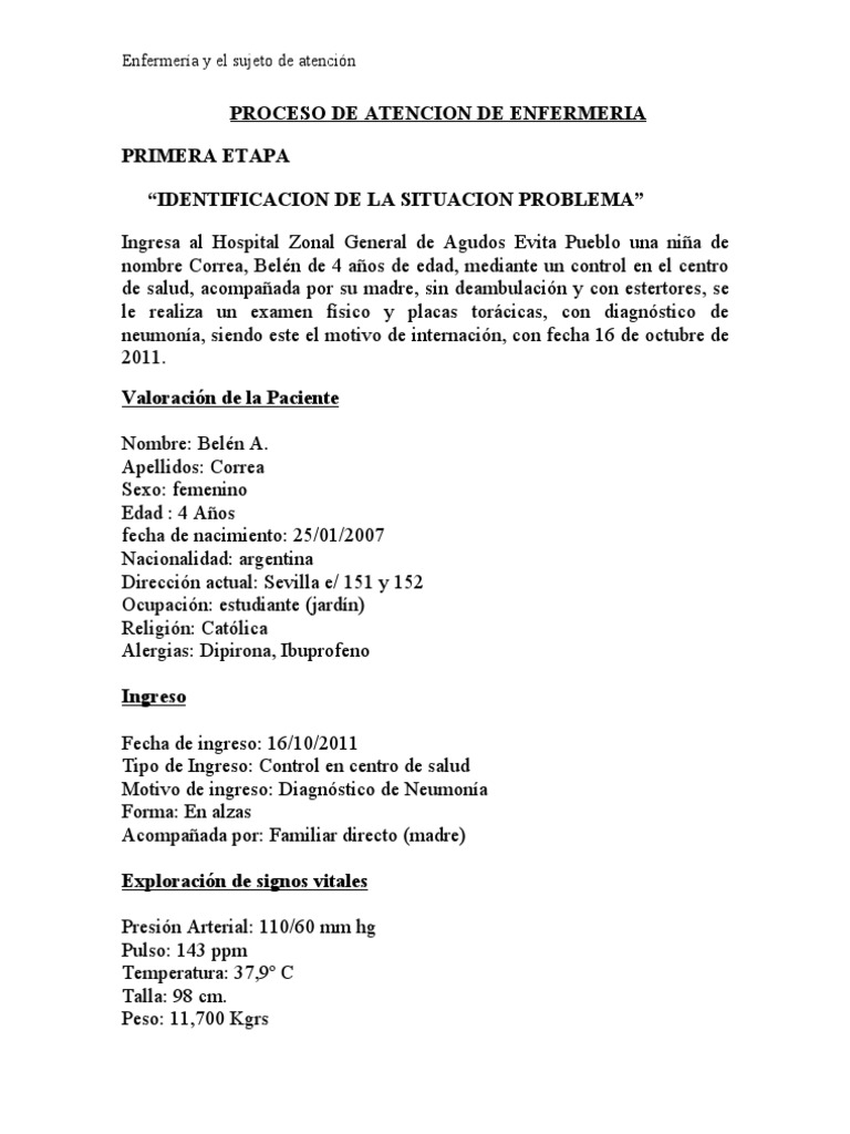 PROCESO DE ATENCION DE ENFERMERIA PRIMERA ETAPA IDENTIFICACION DE LA SITUACION PROBLEMA Ingresa al Hospital Zonal General de Agudos Evita Pueblo una nia de nombre Correa, Beln de 4 aos de edad, mediante un control en el centro de salud, acompaada por su madre, sin deambulacin y con estertores, se le realiza un examen fsico y placas torcicas, con diagnstico de neumona, siendo este el motivo de internacin, con fecha 16 de octubre de 2011. Valoracin de la Paciente Nombre: Beln A. Apellidos: Correa Sexo: femenino Edad : 4 Aos fecha de nacimiento: 25/01/2007 Nacionalidad: argentina Direccin actual: Sevilla e/ 151 y 152 Ocupacin: estudiante (jardn) Religin: Catlica Alergias: Dipirona, Ibuprofeno Ingreso Fecha de ingreso: 16/10/2011 Tipo de Ingreso: Control en centro de salud Motivo de ingreso: Diagnstico de Neumona Forma: En alzas Acompaada por: Familiar directo (madre) Exploracin de signos vitales Presin Arterial: 110/60 mm hg Pulso: 143 ppm Temperatura: 37,9 C Talla: 98 cm. Peso: 11,700 Kgrs