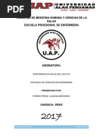 Movilizacin: Las actividades cotidianas hasta el ingreso (alimentacin, aseo, vestido) las realizaba con ayuda, en general, de la madre, la eliminacin en paal y no deambulaba. Actualmente, en la sala, sigue sin cambio alguno. Alimentacin y Bebida: El peso actual es de 10,200ks. y el peso al ingreso era de 11,700ks., la madre no refiere prdida de peso antes del ingreso. Sus hbitos dietticos antes del ingreso eran variados, modificndose al momento de ingreso al haberse suspendido la alimentacin. Las piezas dentarias estn completas pero carcomidas y negras, se observa halitosis, labios resecos y partidos. Por va parenteral, a una velocidad de infusin de 42 microgotas por minuto, observamos: -Dextrosa al 5% 500cc -ClNa 20% 6cc -ClK 1M 10cc Eliminacin: Miccin: se observa una frecuencia de 3 a 4 veces por da, con nicturia e incontinencia. Defecacin: se observa una cada 3 das. En la casa la frecuencia era de 1 vez por da. Control de la Temperatura Corporal: Temperatura axilar: 36,8C. No hay signos de sudoracin, escalofros, sed, hiperpnea, taquipnea. Comunicacin: Nivel de conciencia: letrgica -Conducta: hipoactiva Estado Neurosensorial: -Pupilas: isocricas reactivas Sensorio -Visin: normal -Audicin: normal -Olfato: normal -Gusto: no apreciable -Tacto: normal