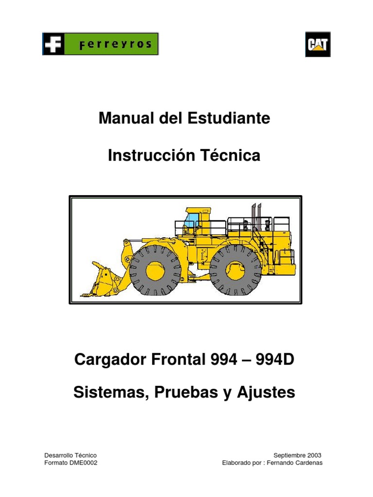Al termino del curso, los estudiantes deben tener la capacidad de realizar los siguientes procesos : * Ubicar los puntos de servicio del cargador frontal 994-994D de acuerdo a la lista de revision de mantenimiento preventivo y al Manual de Operacin y Mantenimiento. * Obtener informacin del Sistema de Monitoreo para mantenimiento y diagnostico. * Utilizando el Manual de Servicio apropiado ubicar los componentes de los sistemas del maquina. * Explicar el funcionamiento de los sistemas de transmisin, lubricacin, implementos hidrulicos, direccin, frenos utilizando el manual de servicio y hojas de trabajo. * Realizar pruebas y ajustes de los sistemas orientando al diagnostico y solucin de problemas de la maquina.