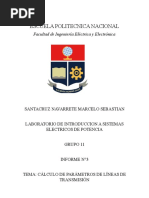 Datos Tcnicos Lnea Pifo -Yaguachi Voltaje Nominal 500 kV Corriente Nominal 1.0 kA Longitud 300 km Nmero de Circuitos 1 Tipo ACAR Conductor de Fase Calibre 750 kCM [Link] Subconductores 4 Parmetros Elctricos Resistencia Sec. 1,2 R (1,2) 0.229 Ohm/km Reactancia Sec. 1,2 X (1,2) 0.3234 Ohm/km Susceptancia Sec. 1,2 B (1,2) 5.1011 S/km Conductancia Sec. 1,2 G (1,2) 0 S/km Resistencia Sec. 0 R (0) 0.2958 Ohm/km Reactancia Sec. 0 X (0) 1.1025 Ohm/km Susceptancia Sec. 0 B (0) 3.3581 S/km Conductancia Sec. 0 G (0) 0 S/km