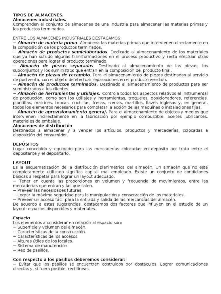 Comprenden el conjunto de almacenes de una industria para almacenar las materias primas y los productos terminados. ENTRE LOS ALMACENES INDUSTRIALES DESTACAMOS: Almacn de materia prima. Almacena las materias primas que intervienen directamente en la composicin de los productos terminados. Almacn de productos semielaborados. Dedicado al almacenamiento de los materiales que ya han sufrido algunas transformaciones en el proceso productivo y resta efectuar otras operaciones para lograr el producto terminado. Almacn de piezas separadas. Destinado al almacenamiento de las piezas, los subconjuntos y los suministros que entran en la composicin del producto final. Almacn de piezas de recambio. Para el almacenamiento de piezas destinadas al servicio de postventa, con el objeto de efectuar reparaciones en el producto vendido. Almacn de productos terminados. Destinado al almacenamiento de productos para ser suministrados a los clientes. Almacn de herramientas y utillajes. Controla todos los aspectos relativos al instrumental de produccin, como son los utillajes y herramientas, troqueles, posicionadores, referencias, plantillas, matrices, brocas, cuchillas, fresas, sierras, martillos, llaves inglesas y, en general, todos los elementos necesarios para completar la accin de las maquinas o instalaciones fijas. Almacn de aprovisionamiento genera/. Para el almacenamiento de objetos y medios que intervienen indirectamente en la fabricacin por ejemplo combustible, aceites lubricantes, materiales de embalaje. Almacenes de distribucin Destinados a almacenar y a vender los artculos, productos y mercaderas, colocadas a disposicin del consumidor. DEPSITOS Lugar concebido y equipado para las mercaderas colocadas en depsito por trato entre el depositante y el depositarlo. LAYOUT Es la esquematizacin de la distribucin planimtrica del almacn. Un almacn que no est completamente utilizado significa capital mal empleado. Existe un conjunto de condiciones bsicas a respetar para lograr un layout adecuado. Tener en cuenta las proporciones en volumen y frecuencia de movimientos, entre las mercaderas que entran y las que salen. Preveer las necesidades futuras. Lograr la mxima seguridad para la manipulacin y conservacin de los materiales. Preveer un acceso fcil para la entrada y salida de las mercancas del almacn. De acuerdo a estas sugerencias, destacamos dos factores que influyen en el estudio de un layout: espacios disponibles y materiales. Espacio Los elementos a considerar en relacin al espacio son: Superficie y volumen del almacn. Caractersticas de la construccin. Caractersticas de los accesos. Alturas tiles de los locales. Sistema de manutencin. Red de pasillos. Con respecto a los pasillos deberemos considerar: Evitar que los pasillos se encuentren obstruidos por obstculos. Lograr comunicaciones directas y, si fuera posible, rectilneas.