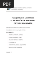 7. Enharinado Consiste en rebozar y enharinar el pescado previamente salado, empleando harina de trigo del tipo extra. Esta operacin se realiza en una mesa de acero inoxidable empleando recipientes apropiados. Despus de embeberse la harina adherida en el primer tratamiento, se vuelve a repetir el enharinado; luego se quita la harina poco adherida para evitar impurezas en el aceite que se utilizar al freir. 8. Fritado Para efectuar esta operacin, se coloca el pescado enharinado sobre coladores metlicos, para despus sumergir en un bao de aceite a una temperatura de 150 C. Durante aproximadamente 20 minutos, estando estos en funcin al tamao y grosor del pescado. Se utiliz 20% de aceite vegetal, en relacin a la cantidad del producto enharinado. Estos parmetros deben controlarse cuidadosamente para evitar un exceso de temperatura, que podra originar alteraciones del aceite (polimerizaciones). 9. Enfriado Concluido el fritado, se drena y enfra el producto en un ambiente libre de contaminaciones. 10. Envasado Inmediatamente despus del enfriado, el producto se envasa en empaques al vaco, a razn de 250 gramos/bolsa. 11. Preparacin del Lquido Aromatizado Tiene por objeto extraer los componentes spido-aromticos de las especias y verduras, con la cual posteriormente se preparar el lquido de cobertura para el marinado de trucha. Los insumos utilizados son los siguientes: Agua Zanahoria Cebolla Ajos Pimienta picante Pimienta dulce Comino Organo Laurel Canela = = = = = = = = = 60.0% 5.0% 5.0% 1.5% 0.8% = 0.7% 0.7% 0.5% 0.4% 0.1%