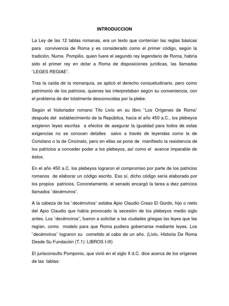 y es considerado como el primer cdigo, segn la tradicin, Numa Pompilio, quien fuere el segundo rey legendario de Roma, habra sido el primer rey en dotar a Roma de disposiciones jurdicas, las llamadas LEGES REGIAE. Tras la cada de la monarqua, se aplic el derecho consuetudinario, pero como patrimonio de los patricios, quienes las interpretaban segn su conveniencia, con el problema de der totalmente desconocidas por la plebe. Segn el historiador romano Tito Livio en su libro Los Orgenes de Roma despus del establecimiento de la Repblica, hacia el ao 450 a.C., los plebeyos exigieron leyes escritas a efectos de asegurar la igualdad para todos de estas exigencias no se conocen detalles salvo a travs de leyendas como la de