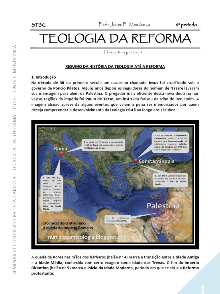 RESUMO DA HISTRIA DA TEOLOGIA AT A REFORMA 1. Introduo Na dcada de 30 do primeiro sculo um nazareno chamado Jesus foi crucificado sob o governo de Pncio Pilatos. Alguns anos depois os seguidores do homem de Nazar levaram sua mensagem para alm da Palestina. O pregador mais eficiente dessa nova doutrina nas vastas regies do imprio foi Paulo de Tarso, um instrudo fariseu da tribo de Benjamim. A imagem abaixo apresenta alguns eventos que valem a pena ser memorizados por quem deseja compreender o desenvolvimento da teologia crist ao longo dos sculos: