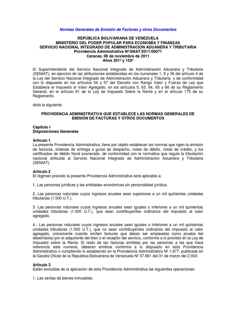 Y FINANZAS SERVICIO NACIONAL INTEGRADO DE ADMINISTRACIN ADUANERA Y TRIBUTARIA Providencia Administrativa N/SNAT/2011/00071 Caracas, 08 de noviembre de 2011 Aos 201 y 152 El Superintendente del Servicio Nacional Integrado de Administracin Aduanera y Tributaria (SENIAT), en ejercicio de las atribuciones establecidas en los numerales 1, 8 y 36 del artculo 4 de la Ley del Servicio Nacional Integrado de Administracin Aduanera y Tributaria, y de conformidad con lo dispuesto en los artculos 54 y 57 del Decreto con Rango Valor y Fuerza de Ley que Establece el Impuesto al Valor Agregado, en los artculos 5, 63, 64, 65 y 66 de su Reglamento General, en el artculo 91 de la Ley de Impuesto Sobre la Renta y en el artculo 175 de su Reglamento. dicta la siguiente: PROVIDENCIA ADMINISTRATIVA QUE ESTABLECE LAS NORMAS GENERALES DE EMISIN DE FACTURAS Y OTROS DOCUMENTOS Captulo I Disposiciones Generales Artculo 1 La presente Providencia Administrativa, tiene por objeto establecer las normas que rigen la emisin de facturas, rdenes de entrega o guas de despacho, notas de dbito, notas de crdito, y los certificados de dbito fiscal exonerado, de conformidad con la normativa que regula la tributacin nacional atribuida al Servicio Nacional Integrado de Administracin Aduanera y Tributaria (SENIAT). Artculo 2 El rgimen previsto la presente Providencia Administrativa ser aplicable a: 1. Las personas jurdicas y las entidades econmicas sin personalidad jurdica. 2. Las personas naturales cuyos ingresos anuales sean superiores a un mil quinientas unidades tributarias (1.500 U.T.). 3. Las personas naturales cuyos ingresos anuales sean iguales o inferiores a un mil quinientas unidades tributarias (1.500 U.T.), que sean contribuyentes ordinarios del impuesto al valor agregado. 4.- Las personas naturales cuyos ingresos anuales sean iguales o inferiores a un mil quinientas unidades tributarias (1.500 U.T.), que no sean contribuyentes ordinarios del impuesto al valor agregado, nicamente cuando emitan facturas que deban ser empleadas como prueba del desembolso por el adquirente del bien o el receptor del servicio, conforme a lo previsto en la Ley de Impuesto sobre la Renta. El resto de las facturas emitidas por las personas a las que hace referencia este numeral, debern emitirse conforme a lo dispuesto en esta Providencia Administrativa o cumpliendo lo establecido en la Providencia Administrativa N 1.677, publicada en la Gaceta Oficial de la Repblica Bolivariana de Venezuela N 37.661 del 31 de marzo del 2.003. Artculo 3 Estn excluidas de la aplicacin de esta Providencia Administrativa las siguientes operaciones: 1. Las ventas de bienes inmuebles.