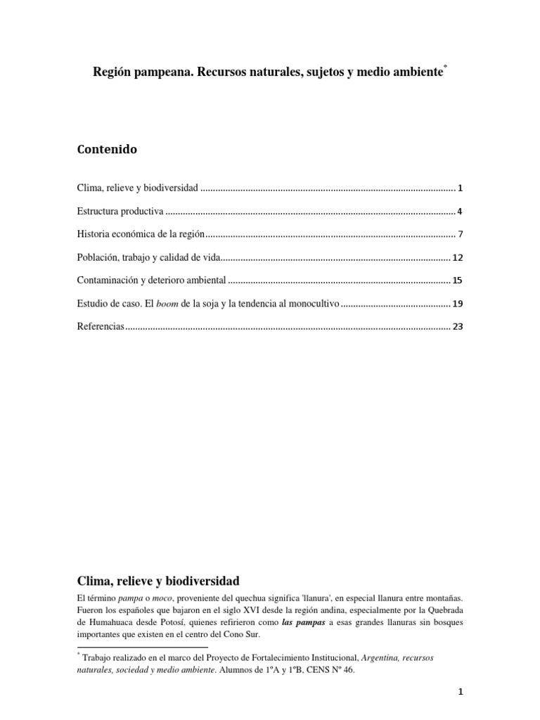 Clima, relieve y biodiversidad ...................................................................................................... 1 Estructura productiva .................................................................................................................... 4 Historia econmica de la regin .................................................................................................... 7 Poblacin, trabajo y calidad de vida............................................................................................ 12 Contaminacin y deterioro ambiental ......................................................................................... 15 Estudio de caso. El boom de la soja y la tendencia al monocultivo ............................................ 19 Referencias .................................................................................................................................. 23