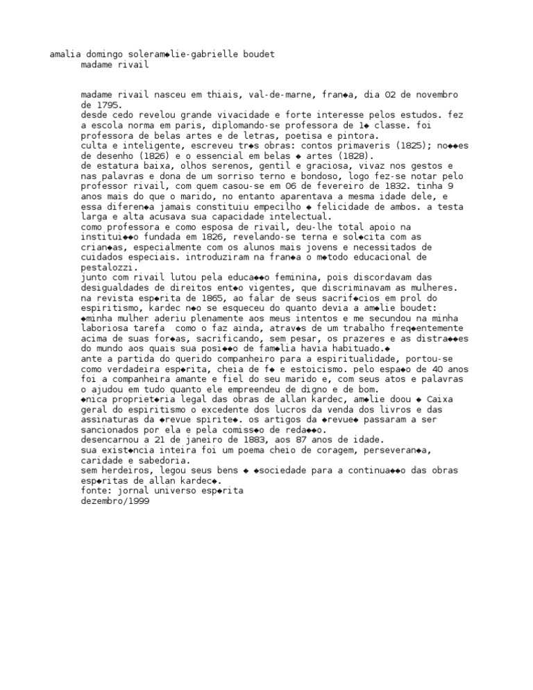 de 1795. desde cedo revelou grande vivacidade e forte interesse pelos estudos. fez a escola norma em paris, diplomando-se professora de 1� classe. foi professora de belas artes e de letras, poetisa e pintora. culta e inteligente, escreveu tr�s obras: contos primaveris (1825); no��es de desenho (1826) e o essencial em belas � artes (1828). de estatura baixa, olhos serenos, gentil e graciosa, vivaz nos gestos e nas palavras e dona de um sorriso terno e bondoso, logo fez-se notar pelo professor rivail, com quem casou-se em 06 de fevereiro de 1832. tinha 9 anos mais do que o marido, no entanto aparentava a mesma idade dele, e essa diferen�a jamais constituiu empecilho � felicidade de ambos. a testa larga e alta acusava sua capacidade intelectual. como professora e como esposa de rivail, deu-lhe total apoio na institui��o fundada em 1826, revelando-se terna e sol�cita com as crian�as, especialmente com os alunos mais jovens e necessitados de cuidados especiais. introduziram na fran�a o m�todo educacional de pestalozzi. junto com rivail lutou pela educa��o feminina, pois discordavam das desigualdades de direitos ent�o vigentes, que discriminavam as mulheres. na revista esp�rita de 1865, ao falar de seus sacrif�cios em prol do espiritismo, kardec n�o se esqueceu do quanto devia a am�lie boudet: �minha mulher aderiu plenamente aos meus intentos e me secundou na minha laboriosa tarefa como o faz ainda, atrav�s de um trabalho freq�entemente acima de suas for�as, sacrificando, sem pesar, os prazeres e as distra��es do mundo aos quais sua posi��o de fam�lia havia habituado.� ante a partida do querido companheiro para a espiritualidade, portou-se como verdadeira esp�rita, cheia de f� e estoicismo. pelo espa�o de 40 anos foi a companheira amante e fiel do seu marido e, com seus atos e palavras o ajudou em tudo quanto ele empreendeu de digno e de bom. �nica propriet�ria legal das obras de allan kardec, am�lie doou � Caixa geral do espiritismo o excedente dos lucros da venda dos livros e das assinaturas da �revue spirite�. os artigos da �revue� passaram a ser sancionados por ela e pela comiss�o de reda��o. desencarnou a 21 de janeiro de 1883, aos 87 anos de idade. sua exist�ncia inteira foi um poema cheio de coragem, perseveran�a, caridade e sabedoria. sem herdeiros, legou seus bens � �sociedade para a continua��o das obras esp�ritas de allan kardec�. fonte: jornal universo esp�rita dezembro/1999