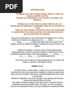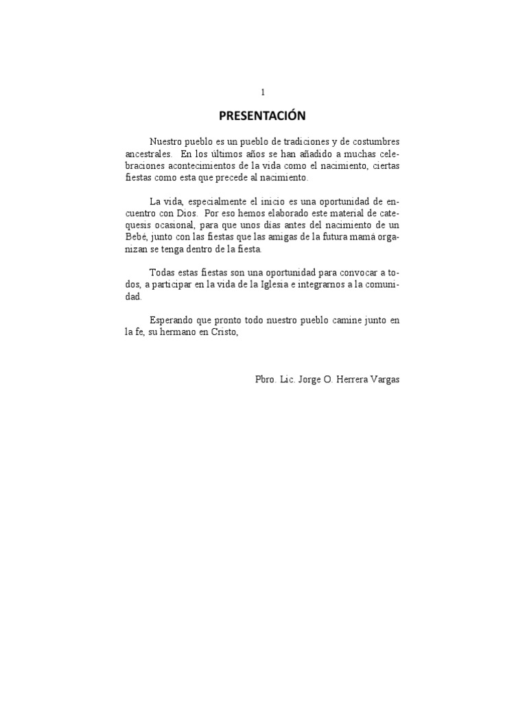 Nuestro pueblo es un pueblo de tradiciones y de costumbres ancestrales. En los ltimos aos se han aadido a muchas celebraciones acontecimientos de la vida como el nacimiento, ciertas fiestas como esta que precede al nacimiento. La vida, especialmente el inicio es una oportunidad de encuentro con Dios. Por eso hemos elaborado este material de catequesis ocasional, para que unos das antes del nacimiento de un Beb, junto con las fiestas que las amigas de la futura mam organizan se tenga dentro de la fiesta. Todas estas fiestas son una oportunidad para convocar a todos, a participar en la vida de la Iglesia e integrarnos a la comunidad. Esperando que pronto todo nuestro pueblo camine junto en la fe, su hermano en Cristo,