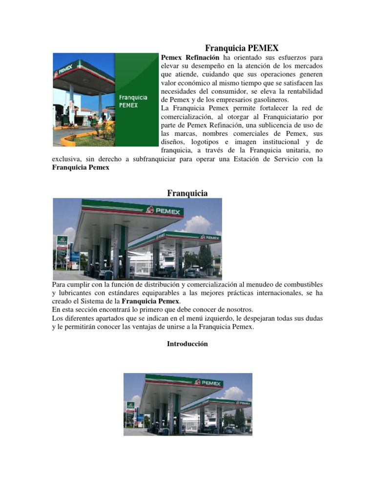 Para cumplir con la funcin de distribucin y comercializacin al menudeo de combustibles y lubricantes con estndares equiparables a las mejores prcticas internacionales, se ha creado el Sistema de la Franquicia Pemex. En esta seccin encontrar lo primero que debe conocer de nosotros. Los diferentes apartados que se indican en el men izquierdo, le despejaran todas sus dudas y le permitirn conocer las ventajas de unirse a la Franquicia Pemex. Introduccin