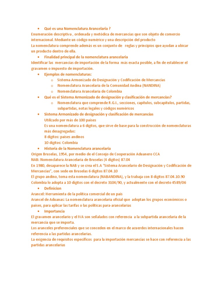 La nomenclatura arancelaria es una enumeracin descriptiva, ordenada y metdica de mercancas que son objeto de comercio internacional, las cuales se identifican mediante un cdigo numrico y una descripcin del producto. Igualmente comprende adems un conjunto de reglas y principios que ayudan a ubicar un producto dentro de ella, ayudan a identificar las mercancas de importacin de la forma ms exacta posible, a fin de establecer el gravamen o impuesto de importacin. Importancia de la clasificacin arancelaria: En todos los pases, el gravamen arancelario y los impuestos indirectos aplicables a la importacin (IVA) estn sealados con referencia a la subpartida arancelaria de la mercanca que se importa. Los aranceles preferenciales que se conceden en el marco de acuerdos internacionales hacen referencia a las partidas arancelarias. En cada pas de destino de nuestras exportaciones, la exigencia de requisitos especficos para la importacin de ciertas mercancas se hace usualmente con referencia a las partidas arancelarias. Cuando se hace una clasificacin arancelaria incorrecta conlleva un menor pago de tributos, y se multa al declarante, lo cual tiene inconvenientes a la hora de llevar acabo el proceso de importacin o exportacin. Ejemplos de nomenclaturas: Sistema Armonizado de Designacin y Codificacin de Mercancas: Utilizada por ms de 100 pases, es una nomenclatura a 6 dgitos, que sirve de base para la construccin de nomenclaturas ms desagregadas: a 8 dgitos: pases andinos a 10 dgitos: Colombia Nomenclatura Arancelaria de la Comunidad Andina (NANDINA): Adoptada por los pases miembros mediante Decisin 370 de 1994 o Nomenclatura comn, a ocho dgitos o 6 primeros dgitos: Cdigo numrico del S.A. o Dgitos sptimo y octavo : Desdoblamientos propios del Grupo Andino. Ceros cuando una subpartida del S. A. no es subdividida Nomenclatura Arancelaria de Colombia: 6 primeros dgitos: o Cdigo numrico del S.A. Dgitos sptimos y octavo v.g. o NANDINA Dgitos noveno y dcimo : o Desdoblamientos introducidos por cada pas importador. Con el tema de la NANDINA se puede decir que constituye la Nomenclatura Comn de los Pases Miembros del Acuerdo de Cartagena y est basada en el Sistema Armonizado de Designacin y Codificacin de Mercancas. Comprende las partidas, subpartidas, cdigos numricos correspondientes, Notas de Seccin, de Captulo y de Subpartidas, Notas Complementarias, as como las Reglas Generales para su interpretacin. El Cdigo numrico de la NANDINA est compuesto de ocho (8) dgitos: Los dos (2) primeros identifican el Captulo; el tercero (3) y el cuarto (4) la Partida; el quinto (5) y el sexto (6) las subpartidas del Sistema Armonizado; y el sptimo (7) y octavo (8) las Subpartidas subregionales. Las mercancas se identificarn en la NANDINA haciendo referencia a los ocho (8) dgitos del cdigo numrico que corresponda. Si una subpartida del Sistema Armonizado no se ha subdividido por necesidades comunitarias, los dgitos sptimo (7) y octavo (8) sern ceros (00). La clasificacin de las mercancas en una subpartida, se ajustar en un todo al ordenamiento previsto en la NANDINA. Los Pases Miembros podrn crear subpartidas nacionales para la clasificacin de mercancas a un nivel ms detallado que el de la NANDINA, siempre que tales subpartidas se incorporen y codifiquen a un nivel superior al del cdigo numrico de ocho (8) dgitos de la NANDINA. No