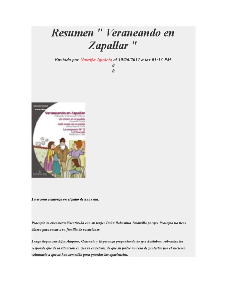 Despus de esto Procopio conversa con Luchito, su hijo y este le cuenta que esta estudiando ingles, Procopio se alegra mucho, le dice que es un ramo til y que sirve para defenderse de los gringos. Cuando ya todos han entrado a la casa Procopio habla solo y dice que al fin va a respirar aire fresco, que ira a echar una modesta cana al aire y se ira a beber unas copas con unos amigos. Cuando Amparo iba saliendo al jardn le pregunta a su madre que donde esta Procopio, Robustina le responde que salio, Amparo con rabia dice que le da mucho coraje no poder salir a divertirse. Consuelo y Esperanza le estaban contando a su madre la descripciones de los novios que les gustaria tener, Robustina les responde a sus hijas que son muy buenos sus gustos. Amparo estaba tan aburrida que decidio salir al patio, cuando despues vio a Ernesto, ella le dijo que bajara de hay para que conversaran. Procopio con una barba postiza llega a su casa despus de haber tomado unas copas, extraado de que su esposa se alejara de el, despus vio a Ernesto que trataba de matarlo, pues todos pensaban que era un ladron, llamaron a la policia y finalmente se dieron cuenta de que era Procopio. Despues de todo lo ocurrido Procopio ordena a su hija Consuelo escribir en un papel : " Han regresado de Zapallar el inminente abogado Don Procopio Rabadilla, su distinguida esposa Robustina Jaramillo y sus hijas Amparo, Consuelo y Esperanza"