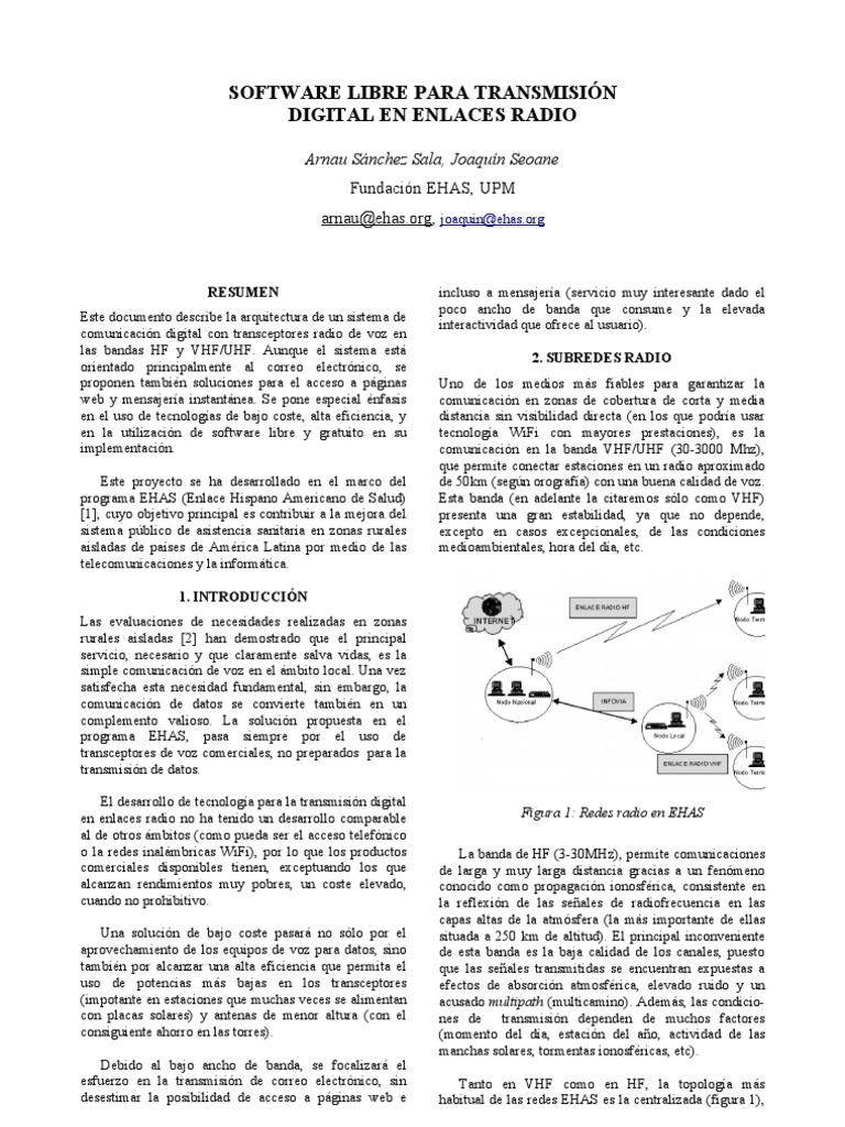 RESUMEN Este documento describe la arquitectura de un sistema de comunicacin digital con transceptores radio de voz en las bandas HF y VHF/UHF. Aunque el sistema est orientado principalmente al correo electrnico, se proponen tambin soluciones para el acceso a pginas web y mensajera instantnea. Se pone especial nfasis en el uso de tecnologas de bajo coste, alta eficiencia, y en la utilizacin de software libre y gratuito en su implementacin. Este proyecto se ha desarrollado en el marco del programa EHAS (Enlace Hispano Americano de Salud) [1], cuyo objetivo principal es contribuir a la mejora del sistema pblico de asistencia sanitaria en zonas rurales aisladas de pases de Amrica Latina por medio de las telecomunicaciones y la informtica. 1. INTRODUCCIN Las evaluaciones de necesidades realizadas en zonas rurales aisladas [2] han demostrado que el principal servicio, necesario y que claramente salva vidas, es la simple comunicacin de voz en el mbito local. Una vez satisfecha esta necesidad fundamental, sin embargo, la comunicacin de datos se convierte tambin en un complemento valioso. La solucin propuesta en el programa EHAS, pasa siempre por el uso de transceptores de voz comerciales, no preparados para la transmisin de datos. El desarrollo de tecnologa para la transmisin digital en enlaces radio no ha tenido un desarrollo comparable al de otros mbitos (como pueda ser el acceso telefnico o la redes inalmbricas WiFi), por lo que los productos comerciales disponibles tienen, exceptuando los que alcanzan rendimientos muy pobres, un coste elevado, cuando no prohibitivo. Una solucin de bajo coste pasar no slo por el aprovechamiento de los equipos de voz para datos, sino tambin por alcanzar una alta eficiencia que permita el uso de potencias ms bajas en los transceptores (impotante en estaciones que muchas veces se alimentan con placas solares) y antenas de menor altura (con el consiguiente ahorro en las torres). Debido al bajo ancho de banda, se focalizar el esfuerzo en la transmisin de correo electrnico, sin desestimar la posibilidad de acceso a pginas web e