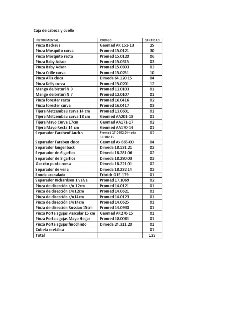 Pinza Backaus Pinza Mosquito curva Pinza Mosquito recta Pinza Baby Adson Pinza Baby Adson Pinza Crille curva Pinza Allis chica Pinza Kelly curva Mango de bistur N 3 Mango de bistur N 7 Pinza forester recta Pinza forester curva Tijera Metzembau curva 14 cm Tijera Metzembau curva 18 cm Tijera Mayo Curva 17cm Tijera Mayo Recta 14 cm Separador Farabeuf Ancho Separador Farabeu chico Separador langenback Separador de 6 garfios Separador de 3 garfios Gancho punta roma Separador de vena Sonda acanalada Separador Richardson 1 valva Pinza de diseccin s/u 12cm Pinza de diseccin c/u12cm Pinza de diseccin s/u14cm Pinza de diseccin c/u14cm Pinza de diseccin Russian 15cm Pinza Porta agujas Vascular 15 cm Pinza Porta agujas Mayo Hegar Pinza Porta agujas finochieto Cubeta metlica Total