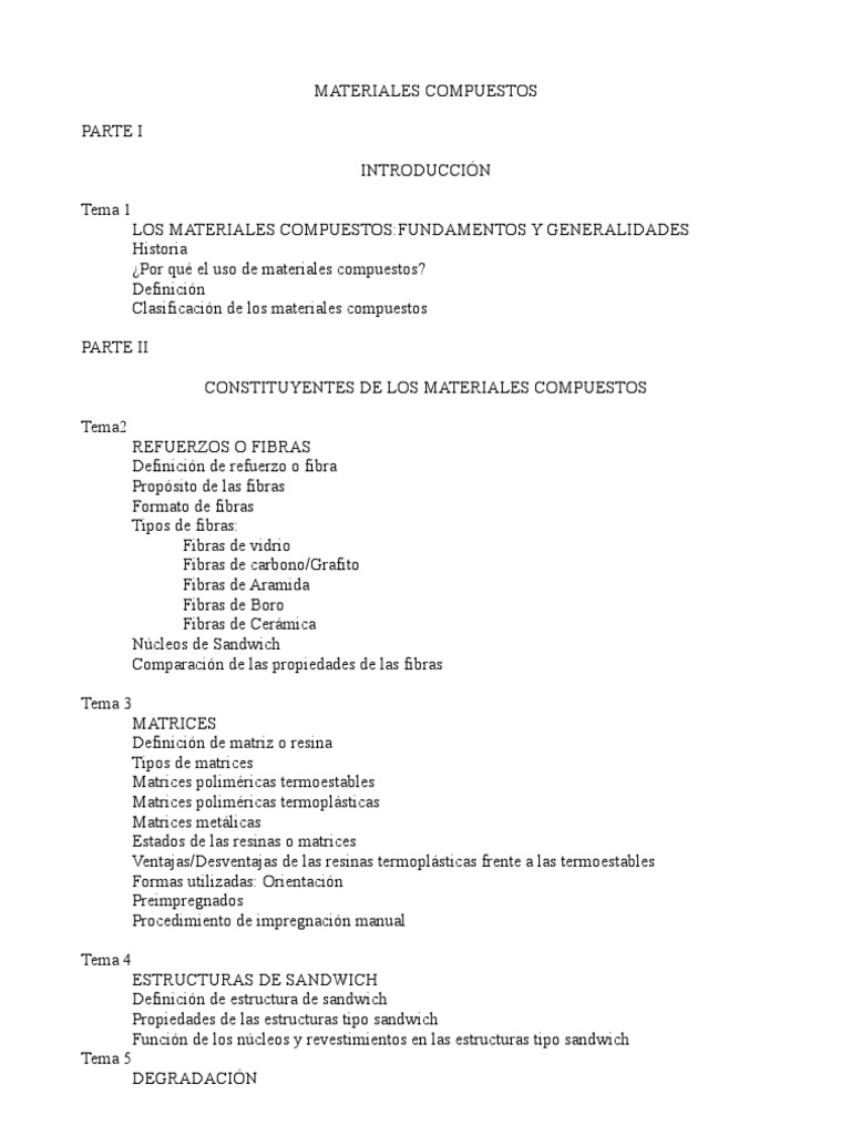 Definicin Clasificacin de los materiales compuestos PARTE II CONSTITUYENTES DE LOS MATERIALES COMPUESTOS Tema2 REFUERZOS O FIBRAS Definicin de refuerzo o fibra Propsito de las fibras Formato de fibras Tipos de fibras: Fibras de vidrio Fibras de carbono/Grafito Fibras de Aramida Fibras de Boro Fibras de Cermica Ncleos de Sandwich Comparacin de las propiedades de las fibras Tema 3 MATRICES Definicin de matriz o resina Tipos de matrices Matrices polimricas termoestables Matrices polimricas termoplsticas Matrices metlicas Estados de las resinas o matrices Ventajas/Desventajas de las resinas termoplsticas frente a las termoestables Formas utilizadas: Orientacin Preimpregnados Procedimiento de impregnacin manual Tema 4 ESTRUCTURAS DE SANDWICH Definicin de estructura de sandwich Propiedades de las estructuras tipo sandwich Funcin de los ncleos y revestimientos en las estructuras tipo sandwich Tema 5 DEGRADACIN