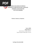TEMA 3 MATRICES DEFINICIN DE MATRIZ O RESINA: Es la parte del material compuesto que soporta las cargas de compresin, mantiene las fibras en su posicin (factor importante para la transmisin de las cargas de traccin en el material compuesto), adems de aportar proteccin contra el dao mecnico y contra el medio ambiente (corrosin, humedad, etc.) adems determinan la temperatura de servicio del material compuesto y controlan la resistencia del composite frente al medio ambiente y agentes externos. TIPOS DE MATRICES: Existen tres tipos de matrices: Matriz Polimrica u orgnica: -Termoestables (O termoendurecibles, una vez polimerizadas no se pueden volver a fundir) Epoxdicas BMI (Bismaleimidas) PI (Polimidas) Poliester Fenlicas Cyanoester -Termoplsticas (Se ablandan o funden con el calor, pudindose adquirir nuevas formas) PEI (Polieterimida) PEEK (polieter eterketona) PEKK (polieter eterketonakenetona) PPS (sulfuro de polifenileno) Matriz Metlica Matriz Cermica MATRICES POLIMRICAS: TERMOESTABLES O TERMOENDURECIBLES: Las resinas lquidas termoestables consisten en una serie de precursores lquidos o semilquidos, que deben curarse para alcanzar el estado slido, por medios qumicos, trmicos (altas temperaturas), o por medio de radiaciones (UV, gamma, electrones o microondas). Una vez curadas, tienen gran cantidad de enlaces cruzados, y no pueden volver a fundir sin sufrir una grave degradacin. Las ms utilizadas, as como sus propiedades ms comunes, son las siguientes: EPOXI: Son actualmente las resinas ms utilizadas en composites. Tienen excelente adhesividad, resistencia, bajo agrietamiento a contraccin, buena resistencia a la corrosin, buena procesabilidad. Ofrecen mejores caractersticas mecnicas ante un curado lento (2 horas). Se adaptan a los mtodos de fabricacin, por su variedad y sistemas de curado permiten velocidades, temperaturas y tiempos de curado a medida. En aplicaciones de altas prestaciones se usan los prepegs (material compuestoformado por un refuerzo (cinta, tejido, mat, etc) impregnado por una resina en estado A o B, ya que garantizan la mejor calidad del producto).