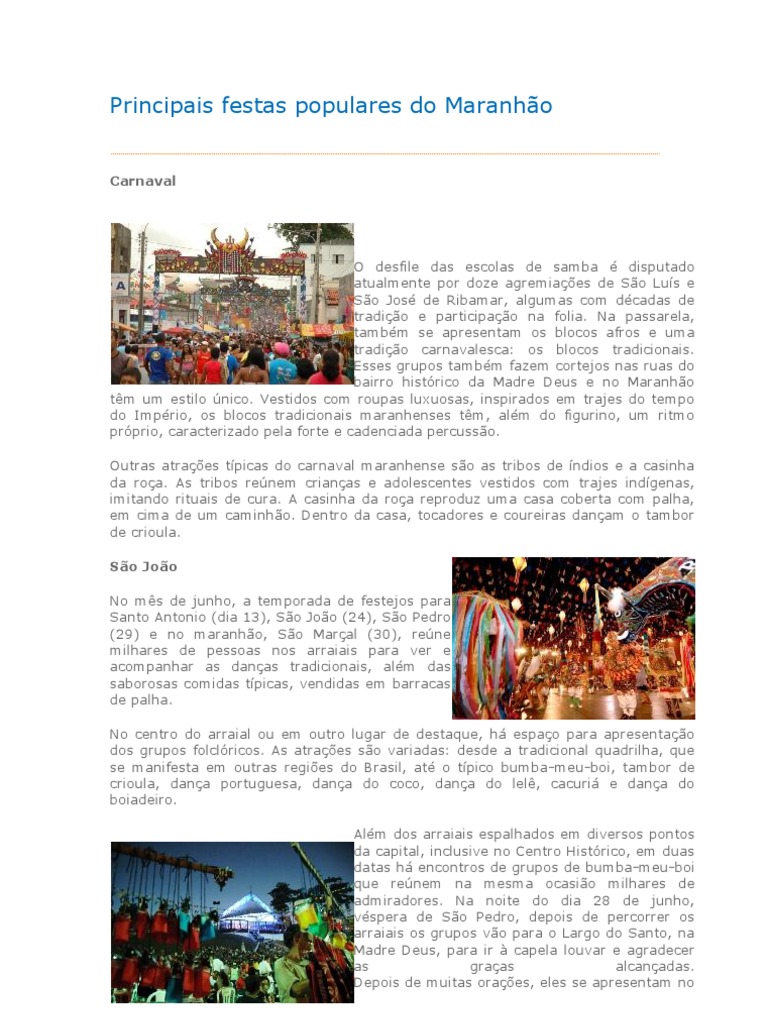 O desfile das escolas de samba disputado atualmente por doze agremiaes de So Lus e So Jos de Ribamar, algumas com dcadas de tradio e participao na folia. Na passarela, tambm se apresentam os blocos afros e uma tradio carnavalesca: os blocos tradicionais. Esses grupos tambm fazem cortejos nas ruas do bairro histrico da Madre Deus e no Maranho tm um estilo nico. Vestidos com roupas luxuosas, inspirados em trajes do tempo do Imprio, os blocos tradicionais maranhenses tm, alm do figurino, um ritmo prprio, caracterizado pela forte e cadenciada percusso. Outras atraes tpicas do carnaval maranhense so as tribos de ndios e a casinha da roa. As tribos renem crianas e adolescentes vestidos com trajes indgenas, imitando rituais de cura. A casinha da roa reproduz uma casa coberta com palha, em cima de um caminho. Dentro da casa, tocadores e coureiras danam o tambor de crioula. So Joo No ms de junho, a temporada de festejos para Santo Antonio (dia 13), So Joo (24), So Pedro (29) e no maranho, So Maral (30), rene milhares de pessoas nos arraiais para ver e acompanhar as danas tradicionais, alm das saborosas comidas tpicas, vendidas em barracas de palha. No centro do arraial ou em outro lugar de destaque, h espao para apresentao dos grupos folclricos. As atraes so variadas: desde a tradicional quadrilha, que se manifesta em outras regies do Brasil, at o tpico bumba-meu-boi, tambor de crioula, dana portuguesa, dana do coco, dana do lel, cacuri e dana do boiadeiro. Alm dos arraiais espalhados em diversos pontos da capital, inclusive no Centro Histrico, em duas datas h encontros de grupos de bumba-meu-boi que renem na mesma ocasio milhares de admiradores. Na noite do dia 28 de junho, vspera de So Pedro, depois de percorrer os arraiais os grupos vo para o Largo do Santo, na Madre Deus, para ir capela louvar e agradecer as graas alcanadas. Depois de muitas oraes, eles se apresentam no