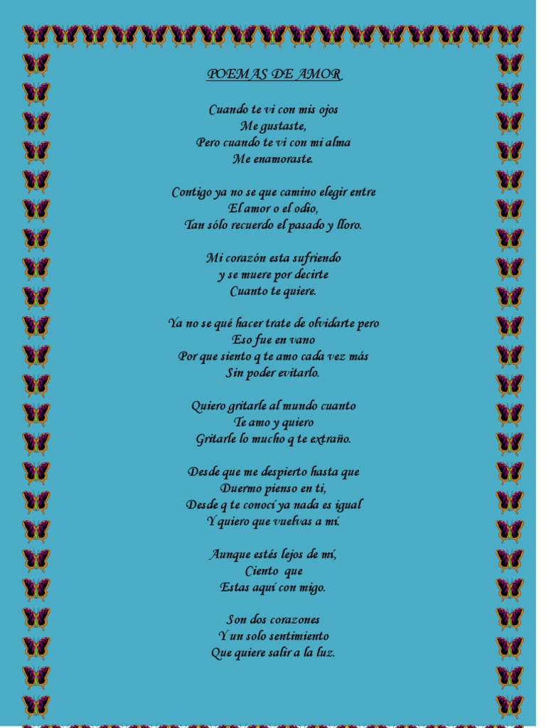 Cuando te vi con mis ojos Me gustaste, Pero cuando te vi con mi alma Me enamoraste. Contigo ya no se que camino elegir entre El amor o el odio, Tan slo recuerdo el pasado y lloro. Mi corazn esta sufriendo y se muere por decirte Cuanto te quiere. Ya no se qu hacer trate de olvidarte pero Eso fue en vano Por que siento q te amo cada vez ms Sin poder evitarlo. Quiero gritarle al mundo cuanto Te amo y quiero Gritarle lo mucho q te extrao. Desde que me despierto hasta que Duermo pienso en ti, Desde q te conoc ya nada es igual Y quiero que vuelvas a m. Aunque ests lejos de m, Ciento que Estas aqu con migo. Son dos corazones Y un solo sentimiento Que quiere salir a la luz.
