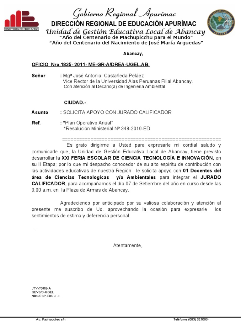 Abancay, OFICIO Nro. 1672- 2011- ME-GR-A/DREA-UGEL.AB. Seor : Prof. MARCO ANTONIO IBARRA CONTRERAS DIRECTOR DEL CEBE LA SALLE - ABANCAY CIUDAD.Asunto Ref. : NOMBRA JURADO CALIFICADOR. : *Plan Operativo Anual *Resolucin Ministerial N 348-2010-ED ======================================================== Es grato dirigirme a Usted para expresarle mi cordial saludo y comunicarle que, la Unidad de Gestin Educativa Local de Abancay, tiene previsto llevar a cabo el VIII Concurso Nacional de Argumentacin y Debate 2011 Preservemos el Santuario Histrico de Machupicchu, en su II Etapa; por lo que mi despacho, conocedor de su alto espritu de contribucin con las actividades educativas de nuestra Regin, , le nombra JURADO CALIFICADOR; dicho evento se llevara a cabo el da 17 de agosto del ao en curso a horas 9:00 a.m. en el local Casa de la Cultura - Abancay. Agradeciendo por anticipado por su valiosa colaboracin y atencin al presente me suscribo de Ud. aprovechando la ocasin para expresarle los sentimientos de estima y deferencia personal. Atentamente,