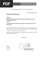 Ao del Centenario de Machupicchu para el Mundo Ao del Centenario del Nacimiento de Jos Mara Arguedas Orientaciones para el inicio del Ao Escolar 2011 en las Instituciones Educativas del mbito de la Direccin Regional de Educacin de Apurmac; a la fecha su representada no cumple en remitir los documentos requeridos causando mi EXTRAEZA POR INCUMPLIMIENTO DE DEBERES TICOS, DEONTOLGICOS Y DE FUNCIN. Sobre el particular debo manifestar que, en su condicin de Director de la Institucin Educativa a su cargo ha incumplido con entregar los documentos de Gestin para el presente ao lectivo 2011, que son referentes para el Trabajo Administrativo y Tcnico Pedaggico, POR TANTO, mi despacho ha dispuesto, como medida correctiva y preventiva otorgarle como plazo final de regularizacin de los documentos mencionados hasta el 20 de Agosto del 2011. como fecha lmite de entrega. Sin otro particular, me suscribo de Usted. Atentamente,