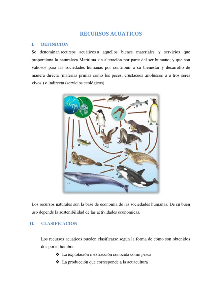 I. DEFINICION Se denominan recursos acuticos a aquellos bienes materiales y servicios que proporciona la naturaleza Martima sin alteracin por parte del ser humano; y que son valiosos para las sociedades humanas por contribuir a su bienestar y desarrollo de manera directa (materias primas como los peces, crustceos ,moluscos u u tros seres vivos ) o indirecta (servicios ecolgicos)