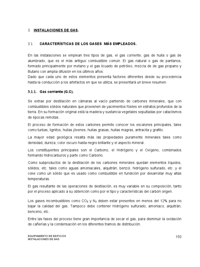En las instalaciones se emplean tres tipos de gas, el gas corriente, gas de hulla o gas de alumbrado, que es el ms antiguo combustible comn. El gas natural o gas de pantanos, formado principalmente por metano y el gas licuado de petrleo, mezcla de de gas propano y Butano con amplia difusin en los ltimos aos. Dado que cada uno de estos elementos presenta factores diferentes desde su procedencia hasta la conduccin a los artefactos en que se utiliza, se presentar un breve resumen.