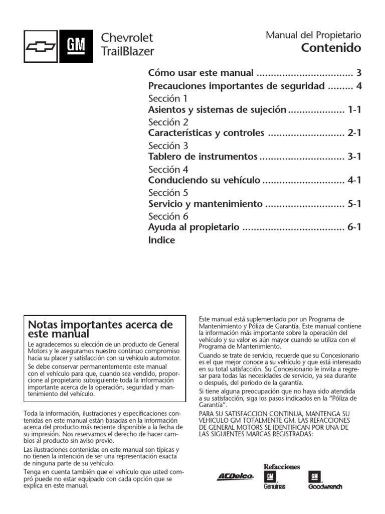 Este manual est suplementado por un Programa de Mantenimiento y Pliza de Garanta. Este manual contiene la informacin ms importante sobre la operacin del vehculo y su valor es an mayor cuando se utiliza con el Programa de Mantenimiento. Cuando se trate de servicio, recuerde que su Concesionario es el que mejor conoce a su vehculo y que est interesado en su total satisfaccin. Su Concesionario le invita a regresar para todas las necesidades de servicio, ya sea durante o despus, del perodo de la garanta. Si tiene alguna preocupacin que no haya sido atendida a su satisfaccin, siga los pasos indicados en la Pliza de Garanta. PARA SU SATISFACCION CONTINUA, MANTENGA SU VEHICULO GM TOTALMENTE GM. LAS REFACCIONES DE GENERAL MOTORS SE IDENTIFICAN POR UNA DE LAS SIGUIENTES MARCAS REGISTRADAS: