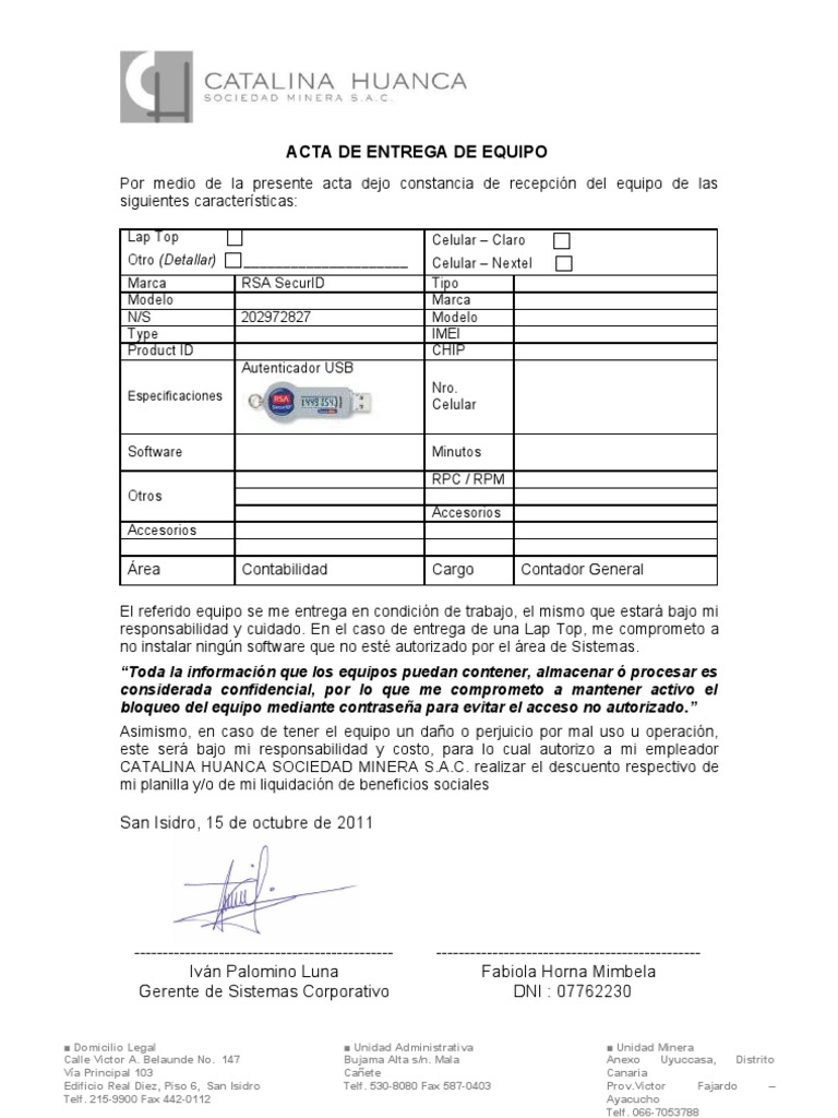 El referido equipo se me entrega en condicin de trabajo, el mismo que estar bajo mi responsabilidad y cuidado. En el caso de entrega de una Lap Top, me comprometo a no instalar ningn software que no est autorizado por el rea de Sistemas. Toda la informacin que los equipos puedan contener, almacenar procesar es considerada confidencial, por lo que me comprometo a mantener activo el bloqueo del equipo mediante contrasea para evitar el acceso no autorizado. Asimismo, en caso de tener el equipo un dao o perjuicio por mal uso u operacin, este ser bajo mi responsabilidad y costo, para lo cual autorizo a mi empleador CATALINA HUANCA SOCIEDAD MINERA S.A.C. realizar el descuento respectivo de mi planilla y/o de mi liquidacin de beneficios sociales