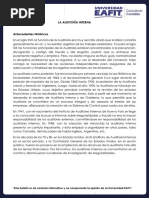 CAPTULO II MARCO TERICO Este segmento de la investigacin, presenta un grupo central de conceptos y teoras que se utiliza para formular y desarrollar el argumento conceptual del trabajo. Esto se refiere a la revisin de literatura, artculos, estudios y libros especficos que tienen relevancia para el estudio en cuestin. Sabino (2002) afirma que el marco terico, tiene el propsito de dar a la investigacin un sistema coordinado y coherente de conceptos y proposiciones que permitan abordar el problema (p. 25); es decir, trata de integrar al problema dentro de un mbito donde ste cobre sentido, incorporando los conocimientos previos relativos al mismo y ordenndolos de modo tal que resulten til a nuestra tarea. De tal forma, en este estudio se presenta los antecedentes, bases tericas y fundamentos legales del mismo. Antecedentes de la Investigacin Para llevar a cabo el desarrollo de esta investigacin se consider una serie de trabajos y tesis documentales de otros Institutos y Universidades de Venezuela y el exterior, las cuales aportaron a al investigadora una base de datos muy importantes para establecer un marco de referencias objetivo y preciso. A continuacin se presentan los antecedentes: Bungacho (2010) realiz en el Instituto De Altos Estudios Nacionales del Ecuador un estudio titulado: Manual De Auditoria Interna Para Instituto De Altos Estudios Nacionales, con el propsito de facilitar la correcta elaboracin de los papeles de trabajo, que son el reflejo de los
