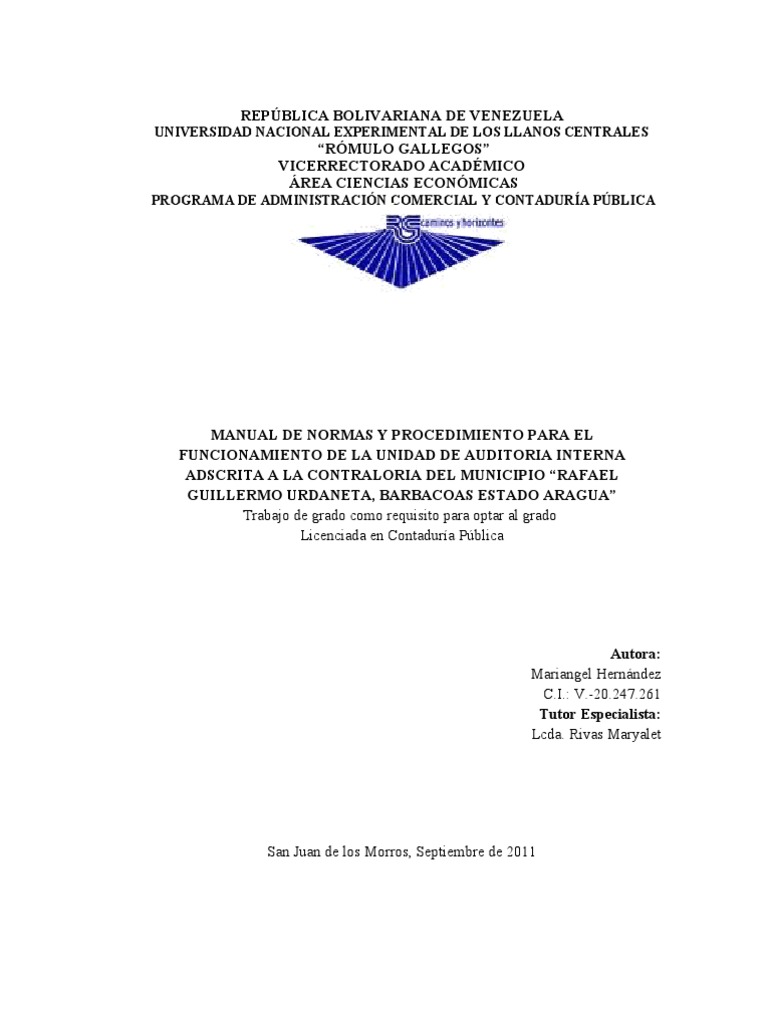 MANUAL DE NORMAS Y PROCEDIMIENTO PARA EL FUNCIONAMIENTO DE LA UNIDAD DE AUDITORIA INTERNA ADSCRITA A LA CONTRALORIA DEL MUNICIPIO RAFAEL GUILLERMO URDANETA, BARBACOAS ESTADO ARAGUA Trabajo de grado como requisito para optar al grado Licenciada en Contadura Pblica