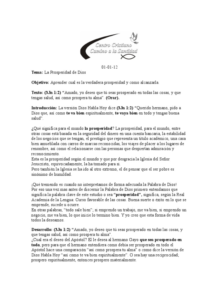 Texto: (3Jn 1:2) Amado, yo deseo que t seas prosperado en todas las cosas, y que tengas salud, as como prospera tu alma. (Orar). Introduccin: La versin Dios Habla Hoy dice (3Jn 1:2) Querido hermano, pido a Dios que, as como te va bien espiritualmente, te vaya bien en todo y tengas buena salud. Qu significa para el mundo la prosperidad? La prosperidad, para el mundo, entre otras cosas est basada en la seguridad del dinero en una cuenta bancaria, la estabilidad de los negocios que se tengan, el prestigio que representa un titulo acadmico, una casa bien amueblada con carros de marcas reconocidas, los viajes de placer a los lugares de renombre, as como el relacionarse con las personas que despiertan admiracin y reconocimiento. Esta es la prosperidad segn el mundo y que por desgracia la Iglesia del Seor Jesucristo, equivocadamente, la ha tomado para si. Pero tambin la Iglesia se ha ido al otro extremo, el de pensar que el ser pobre es sinnimo de humildad. Qu tremendo es cuando no interpretamos de forma adecuada la Palabra de Dios! Por eso una vez mas antes de discernir la Palabra de Dios primero entendamos que significa la palabra clave de este estudio o sea prosperidad, significa, segn la Real Academia de la Lengua: Curso favorable de las cosas. Buena suerte o xito en lo que se emprende, sucede u ocurre. En otras palabras, todo sale bien; si emprendo un trabajo, me va bien, si emprendo un negocio, me va bien, lo que inicie lo termino bien. Y yo creo que esta forma de vida todos la deseamos. Desarrollo: (3Jn 1:2) Amado, yo deseo que t seas prosperado en todas las cosas, y que tengas salud, as como prospera tu alma. Cual era el deseo del Apstol? El le desea al hermano Gayo que sea prosperado en todo, pero para que el hermano entendiera como deba ser prosperado en todo el Apstol hace una comparacin as como prospera tu alma o como dice la versin de Dios Habla Hoy as como te va bien espiritualmente. O sea hay una reciprocidad; prospero espiritualmente, entonces prospero materialmente.