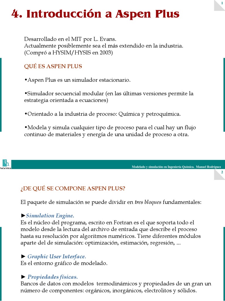 Desarrollado en el MIT por L. Evans. Actualmente posiblemente sea el ms extendido en la industria. (Compr a HYSIM/HYSIS en 2003) QU ES ASPEN PLUS Aspen Plus es un simulador estacionario. Simulador secuencial modular (en las ltimas versiones permite la estrategia orientada a ecuaciones) Orientado a la industria de proceso: Qumica y petroqumica. Modela y simula cualquier tipo de proceso para el cual hay un flujo continuo de materiales y energa de una unidad de proceso a otra.