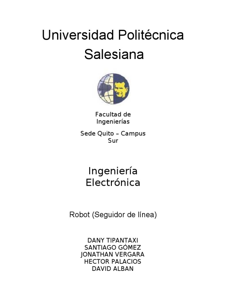 INTODUCCION: Hoy en da en las empresas de mayor reconocimiento mundial, en algunos organismos polticos, en recintos histricos e incluso religiosos podemos observar la actividad y trabajo de robots; maquinas hechas por el hombre que se encargan de facilitar o incluso realizar completamente las tareas humanas de mayor riesgo, peligro y esfuerzo. Tareas que para el hombre resultan difciles, cansadas e incluso mortales, tareas que necesitan ms de una persona lo cual econmicamente genera gastos, las empresas u organismos de cualquier ndole lo que buscan hoy en da es reducir gastos, pero no disminuir la calidad de sus trabajos o productos. Es con esto que surge un problema no tan grave, ya que contamos con recursos tan modernos que nos permiten acceder a mecanismos fciles de manejar, construir y adquirir. Como estudiantes del nivel superior (universidad) consideramos que es necesario presentar alternativas que puedan satisfacer las necesidades antes planteadas, nuestro proyecto presenta un robot seguidor de lnea ya que a lo largo de la vida el ser humano ha querido explorar ciertas cosas las cuales son peligrosas para l, por eso se ha hecho la necesidad de crear este tipo de robots para depositar en el algunas tareas e interpretaciones de seales buscadas por el hombre, y que al momento de captarlas, dicho robot pueda llegar a su punto departida y enviar la informacin que es buscada MARCO TEORICO: