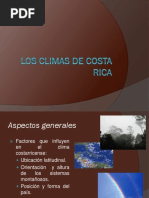 La clasificacin o tipos de climas para Costa Rica utilizado en este documento, se basan en los trabajos de investigacin elaborados por Coen (1967), el cual se fundamenta en tres aspectos, que combinados determinan 13 tipos bsicos de clima, de los cuales, para Costa Rica solo son aplicables nueve, los cuales son los que se citan en este documento. Los aspectos tomados en cuenta son: a. Provincias trmicas.(tma) b. Provincias pluviomtricas.(tlla) c. Rgimen de lluvia anual.(rlla) 2.1. Provincias trmicas Se basa en la temperatura media anual (tma) en grados centgrados (C), as se determinan zonas y regiones denominadas provincias trmicas clasificadas en: zonas o regiones de tierra fra (Microtermal), con tma inferior a 10C, y altura superior a los 2000 metros sobre el nivel del mar (msnm); tierra templada (Mesotermal), con tma entre 10C a 22C, y una altura de 800 a 2000 msnm: y de tierra caliente (Megatermal), con tma superior a los 22C, y una altura de 800 msnm. 2.2. Provincias pluviomtricas Se basa en los totales de lluvia anual, se distinguen tambin tres zonas o regiones denominadas provincias pluviomtricas, las cuales son: Zonas o regiones moderadamente lluviosas con, tlla entre 1000 y 2000 milmetros (mm), zonas o regiones lluviosas con, tlla entre 2000 y 4000 mm y zonas o regiones excesivamente lluviosa con tlla superior a 4000mm. 2.3. Rgimen de lluvia anual Se clasifican climas con estacin seca, clima estacional o intermedio, y clima lluvioso todos los meses. Los tipos de clima establecidos por Coen (1967), son los siguientes: 2.3.1. Excesivo en lluvias del Atlntico: Es tpico de las llanuras del Tortuguero, Santa Clara y Sarapiqu, el total de precipitacin anual excede los 4000 mm. 2.3.2. Excesivo en lluvias del Pacfico: Es muy similar al clima excesivo en lluvias del Atlntico, con la diferencia en que durante los meses de Febrero, Marzo y Abril se da una merma pronunciada de las lluvias. 2.3.3. Lluvioso o Atlntico: Se encuentra en alturas inferiores a 600 msnm, se destaca la merma de la lluvias en los meses de Marzo y Abril, la nubosidad del clima es alta. 2.3.4. Lluvioso con influencia monznica: Las lluvias se distribuyen bien todo el ao, se destaca una merma pronunciada de las lluvias de Enero a Abril. 2.3.5. De sequa: Se encuentra desde el nivel del mar hasta los 800 metros de altitud, comprende las regiones ms calientes y menos lluviosas de Costa Rica. 2.3.6. Faldas de la cordillera del lado Atlntico: Comprende una estrecha franja desde los 600 metros de altura hasta los 1600 a lo largo de las cordilleras, se caracteriza por la distribucin uniforme de las lluvias durante el ao, la nubosidad, neblina y lloviznas es abundante. 2.3.7. Faldas de la cordillera en la Vertiente Pacfica: Se distingue por sus temperaturas moderadas y por los perodos secos en los meses de Enero a Marzo. 2.3.8. Meseta Central: Este clima enlaza el tipo de clima de las faldas del Atlntico, con el clima de las faldas del Pacfico, se caracteriza por sus lluvias moderadas y sus temperaturas frescas. 2.3.9. De altura lluvioso y de altura seco: La baja temperatura es el elemento climtico ms importante de este clima. Se encuentran en alturas superiores a los 1600 metros, las neblinas son muy frecuentes.
