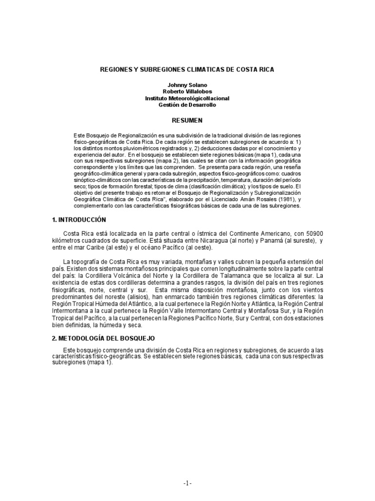 Este Bosquejo de Regionalizacin es una subdivisin de la tradicional divisin de las regiones fsico-geogrficas de Costa Rica. De cada regin se establecen subregiones de acuerdo a: 1) los distintos montos pluviomtricos registrados y, 2) deducciones dadas por el conocimiento y experiencia del autor. En el bosquejo se establecen siete regiones bsicas (mapa 1), cada una con sus respectivas subregiones (mapa 2), las cuales se citan con la informacin geogrfica correspondiente y los lmites que las comprenden. Se presenta para cada regin, una resea geogrfico-climtica general y para cada subregin, aspectos fsico-geogrficos como: cuadros sinptico-climticos con las caractersticas de la precipitacin, temperatura, duracin del perodo seco; tipos de formacin forestal; tipos de clima (clasificacin climtica); y los tipos de suelo. El objetivo del presente trabajo es retomar el Bosquejo de Regionalizacin y Subregionalizacin Geogrfica Climtica de Costa Rica, elaborado por el Licenciado Amn Rosales (1981), y complementarlo con las caractersticas fisiogrficas bsicas de cada una de las subregiones.