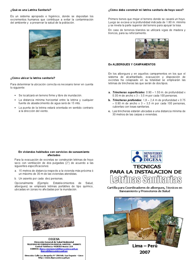 En viviendas habitadas con servicios de saneamiento afectados Para la evacuacin de excretas se construirn letrinas de hoyo seco con ventilacin de dos pulgadas (2) de acuerdo a las siguientes especificaciones: a. 15 metros de distancia respecto a la vivienda ms prxima un mximo de 30 m de las viviendas atendidas. b. Un asiento por cada diez personas. Opcionalmente (Ejemplo: Establecimientos de Salud, albergues) se emplear letrinas porttiles de tipo qumico, ubicadas en zonas no afectadas por la inundacin. Cartilla para Coordinadores de albergues, Tcnicos en Saneamiento y Promotores de Salud