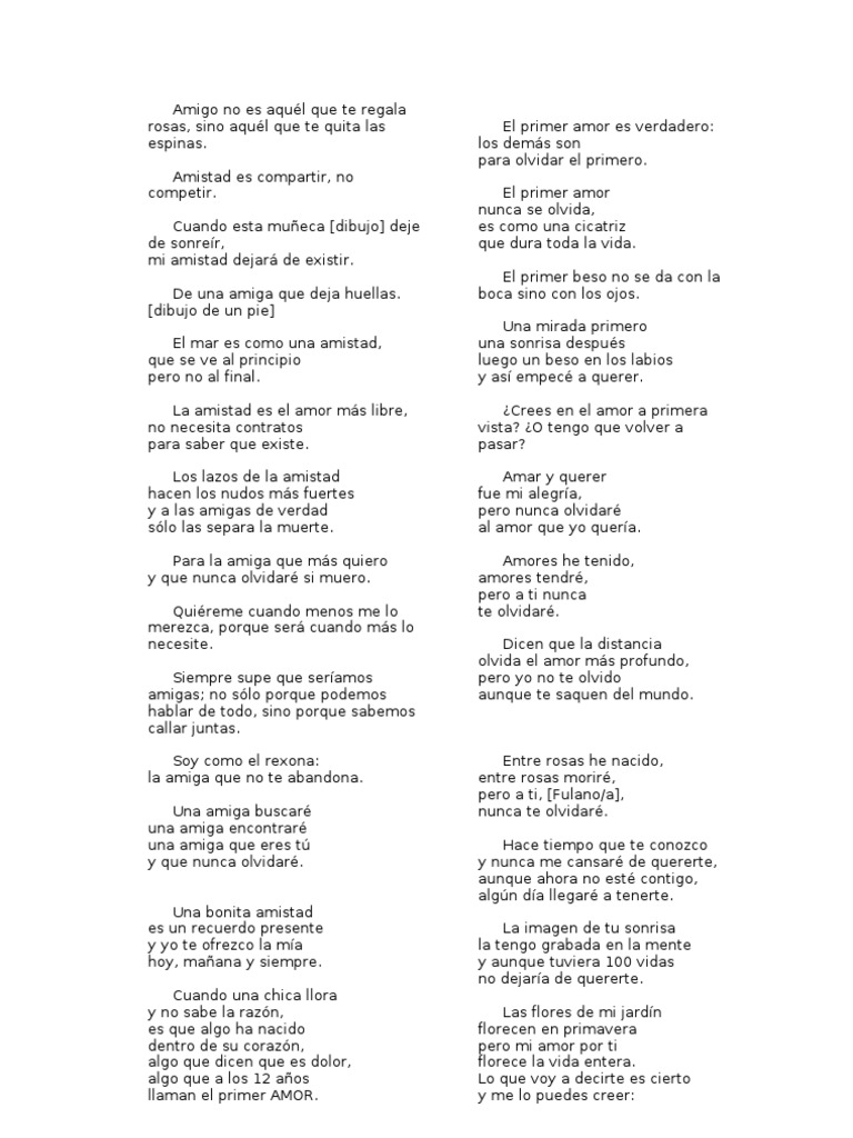 Cuando esta mueca [dibujo] deje de sonrer, mi amistad dejar de existir. De una amiga que deja huellas. [dibujo de un pie] El mar es como una amistad, que se ve al principio pero no al final. La amistad es el amor ms libre, no necesita contratos para saber que existe. Los lazos de la amistad hacen los nudos ms fuertes y a las amigas de verdad slo las separa la muerte. Para la amiga que ms quiero y que nunca olvidar si muero. Quireme cuando menos me lo merezca, porque ser cuando ms lo necesite. Siempre supe que seramos amigas; no slo porque podemos hablar de todo, sino porque sabemos callar juntas. Soy como el rexona: la amiga que no te abandona. Una amiga buscar una amiga encontrar una amiga que eres t y que nunca olvidar. Una bonita amistad es un recuerdo presente y yo te ofrezco la ma hoy, maana y siempre. Cuando una chica llora y no sabe la razn, es que algo ha nacido dentro de su corazn, algo que dicen que es dolor, algo que a los 12 aos llaman el primer AMOR.