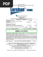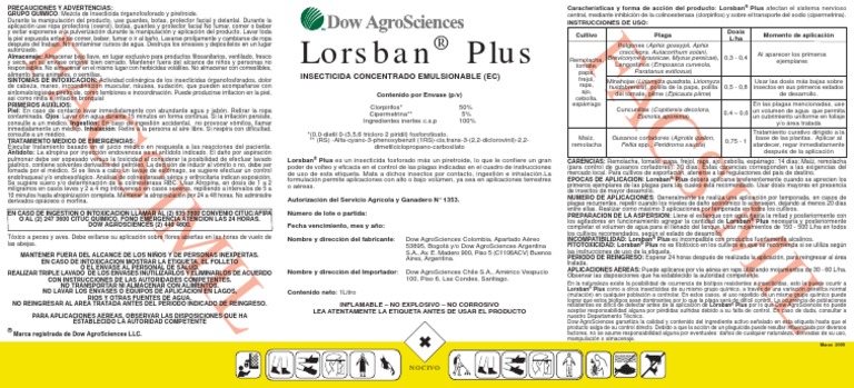 Contenido por Envase (p/v) Clorpirifos* Cipermetrina** Ingredientes inertes c.s.p 50% 5% 100% *(0,0-dietil 0-(3,5,6 tricloro 2 piridil) fosforotioato. ** (RS) -Alfa-cyano-3-phenoxybenzil (1RS)-cis,trans-3-(2,2-diclorovinil)-2,2dimetilciclopropano-carboxilato Lorsban Plus es un insecticida fosforado ms un piretroide, lo que le confiere un gran poder de volteo y eficacia en el control de las plagas indicadas en el cuadro de instrucciones de uso de esta etiqueta. Mata a dichos insectos por contacto, ingestin e [Link] formulacin permite aplicaciones con alto o bajo volmen, ya sea en aplicaciones terrestres o areas. Autorizacin del Servicio Agrcola y Ganadero N 1353. Nmero de lote o partida: Fecha vencimiento, mes y ao: Nombre y direccin del fabricante: Dow AgroSciences Colombia, Apartado Areo 53895, Bogot y/o Dow AgroSciences Argentina S.A., Av. E. Madero 900, Piso 5 (C1106ACV) Buenos Aires, Argentina. Dow AgroSciences Chile S.A., Amrico Vespucio 100, Piso 6, Las Condes, Santiago.