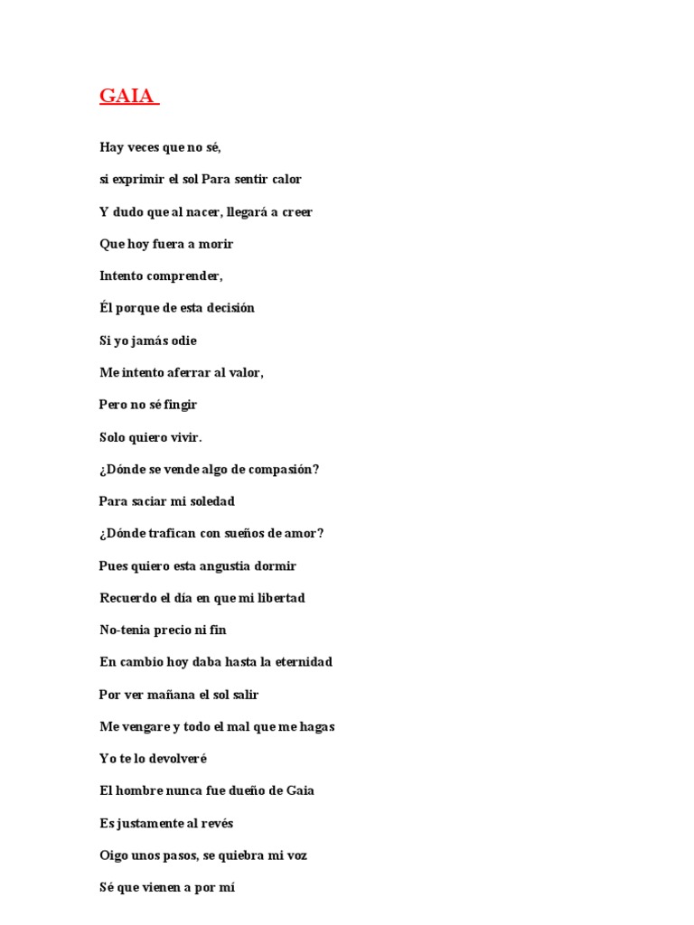 Hay veces que no s, si exprimir el sol Para sentir calor Y dudo que al nacer, llegar a creer Que hoy fuera a morir Intento comprender, l porque de esta decisin Si yo jams odie Me intento aferrar al valor, Pero no s fingir Solo quiero vivir. Dnde se vende algo de compasin? Para saciar mi soledad Dnde trafican con sueos de amor? Pues quiero esta angustia dormir Recuerdo el da en que mi libertad No-tenia precio ni fin En cambio hoy daba hasta la eternidad Por ver maana el sol salir Me vengare y todo el mal que me hagas Yo te lo devolver El hombre nunca fue dueo de Gaia Es justamente al revs Oigo unos pasos, se quiebra mi voz S que vienen a por m