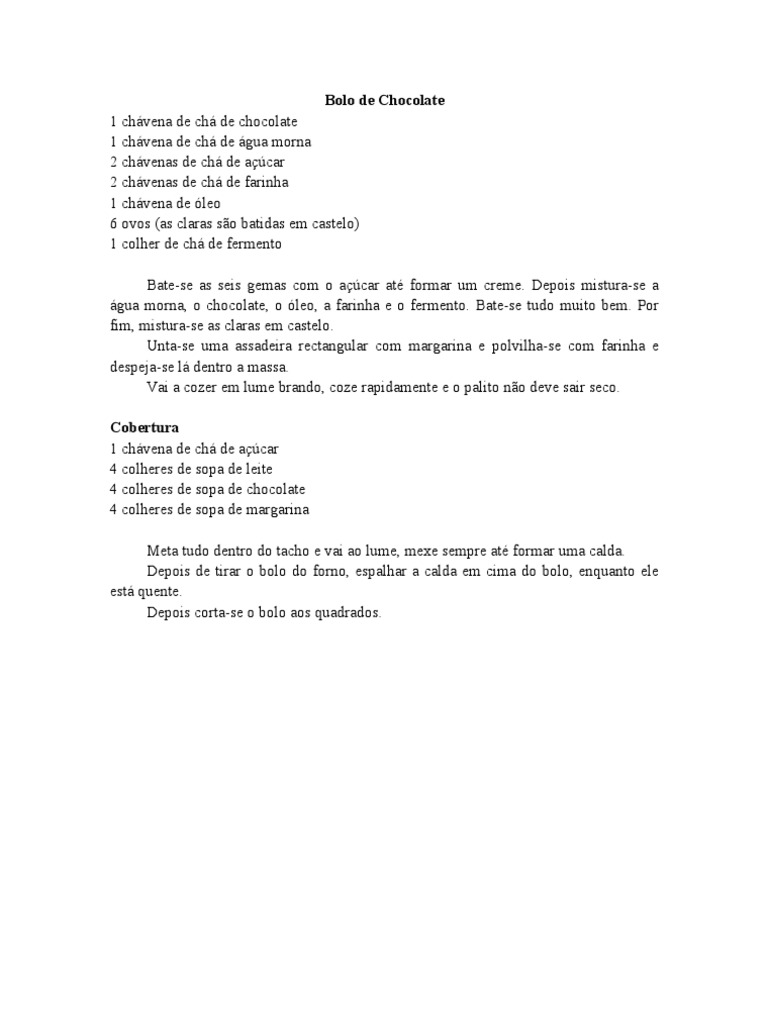 claras so batidas em castelo) 1 colher de ch de fermento Bate-se as seis gemas com o acar at formar um creme. Depois mistura-se a gua morna, o chocolate, o leo, a farinha e o fermento. Bate-se tudo muito bem. Por fim, mistura-se as claras em castelo. Unta-se uma assadeira rectangular com margarina e polvilha-se com farinha e despeja-se l dentro a massa. Vai a cozer em lume brando, coze rapidamente e o palito no deve sair seco. Cobertura 1 chvena de ch de acar 4 colheres de sopa de leite 4 colheres de sopa de chocolate 4 colheres de sopa de margarina Meta tudo dentro do tacho e vai ao lume, mexe sempre at formar uma calda. Depois de tirar o bolo do forno, espalhar a calda em cima do bolo, enquanto ele est quente. Depois corta-se o bolo aos quadrados.