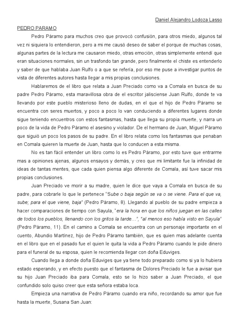 otros miedo, algunos tal vez ni siquiera lo entendieron, pero a mi me caus deseo de saber el porque de muchas cosas, algunas partes de la lectura me causaron miedo, otras emocin, otras simplemente entend que eran situaciones normales, sin un trasfondo tan grande, pero finalmente el chiste es entenderlo y saber de que hablaba Juan Rulfo o a que se refera, por eso me puse a investigar puntos de vista de diferentes autores hasta llegar a mis propias conclusiones. Hablaremos de el libro que relata a Juan Preciado como va a Comala en busca de su padre Pedro Pramo, esta maravillosa obra de el escritor jalisciense Juan Rulfo, donde te va llevando por este pueblo misterioso lleno de dudas, en el que el hijo de Pedro Pramo se encuentra con seres muertos, y poco a poco lo van conduciendo a diferentes lugares donde sigue teniendo encuentros con estos fantasmas, hasta que llega su propia muerte, y narra un poco de la vida de Pedro Pramo el asesino y violador. De el hermano de Juan, Miguel Pramo que sigui un poco los pasos de su padre. En el libro relata como los fantasmas que penaban en Comala quieren la muerte de Juan, hasta que lo conducen a esta misma. No es tan fcil entender un libro como lo es Pedro Pramo, por esto tuve que entrarme mas a opiniones ajenas, algunos ensayos y dems, y creo que mi limitante fue la infinidad de ideas de tantas mentes, que cada quien piensa algo diferente de Comala, as tuve sacar mis propias conclusiones. Juan Preciado ve morir a su madre, quien le dice que vaya a Comala en busca de su padre, para cobrarle lo que le pertenece Sube o baja segn se va o se viene. Para el que va, sube; para el que viene, baja (Pedro Pramo, 8). Llegando al pueblo de su padre empieza a hacer comparaciones de tiempo con Sayula, era la hora en que los nios juegan en las calles de todos los pueblos, llenando con los gritos la tarde, al menos eso haba visto en Sayula (Pedro Pramo, 11). En el camino a Comala se encuentra con un personaje importante en el cuento, Abundio Martnez, hijo de Pedro Pramo tambin, que es quien mas adelante cuenta en el libro que en el pasado fue el quien le quita la vida a Pedro Pramo cuando le pide dinero para el funeral de su esposa, quien le recomienda llegar con doa Eduviges. Cuando llega a donde doa Eduviges que ya tiene todo preparado como si ya lo hubiera estado esperando, y en efecto puesto que el fantasma de Dolores Preciado le fue a avisar que su hijo Juan Preciado iba para Comala, esto se lo hizo saber a Juan Preciado, el que confundido solo quiso creer que esta seora estaba loca. Empieza una narrativa de Pedro Pramo cuando era nio, recordando su amor que fue hasta la muerte, Susana San Juan:
