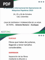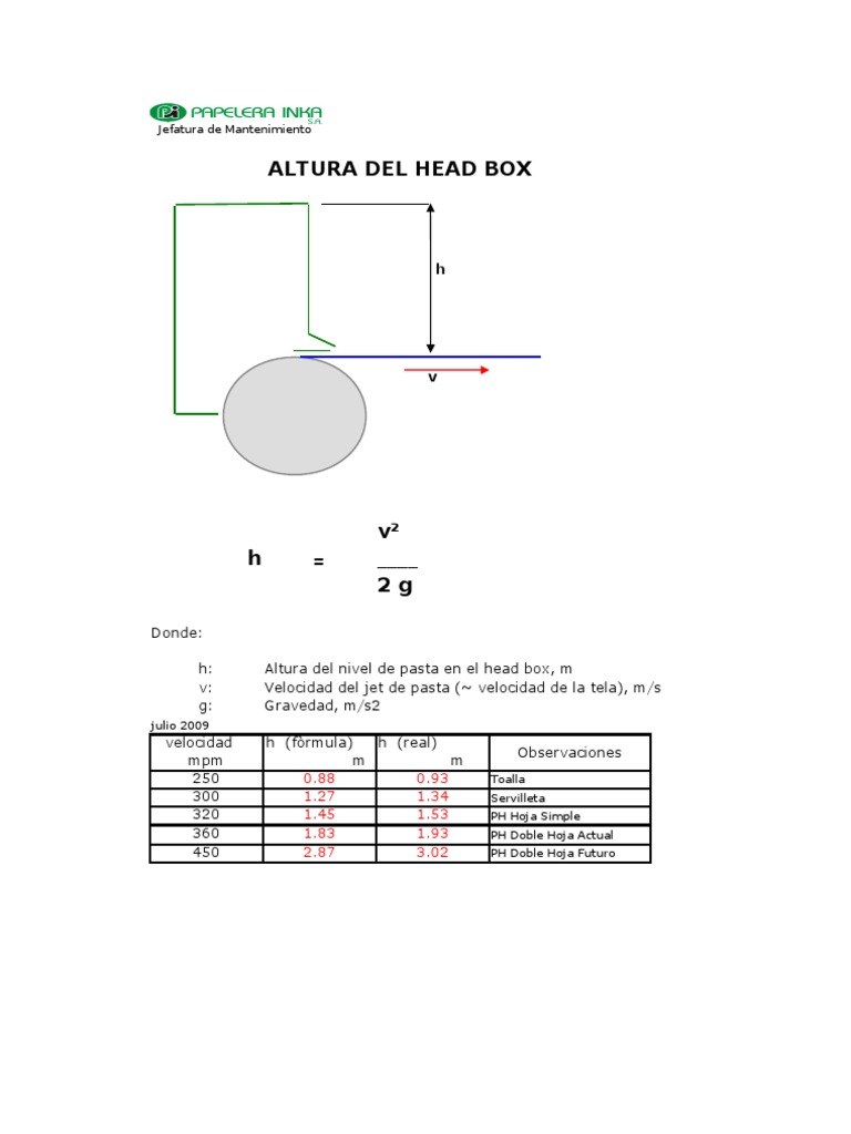 Altura del nivel de pasta en el head box, m Velocidad del jet de pasta (~ velocidad de la tela), m/s Gravedad, m/s2 h (frmula) h (real) m m 0.88 0.93 1.27 1.34 1.45 1.53 1.83 1.93 2.87 3.02 Observaciones